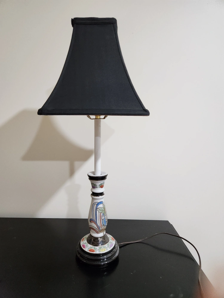 This lamp has a black fabric shade. It has a white porcelain base with painted accents of gold, black, blue, red, and green. The lamp is electric with a cord and an on/off switch.