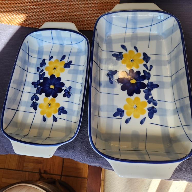Two baking dishes in blue and yellow floral pattern with blue and white checkered background.