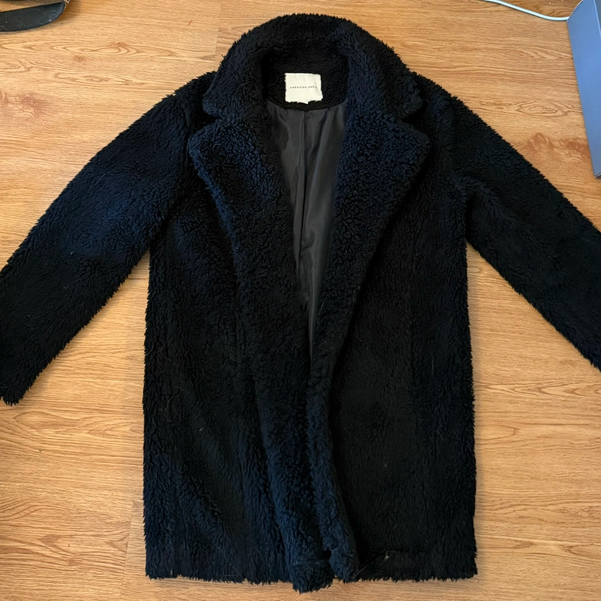 Button closure, bottom of the coat hits the top of the thigh. SUPER warm and soft