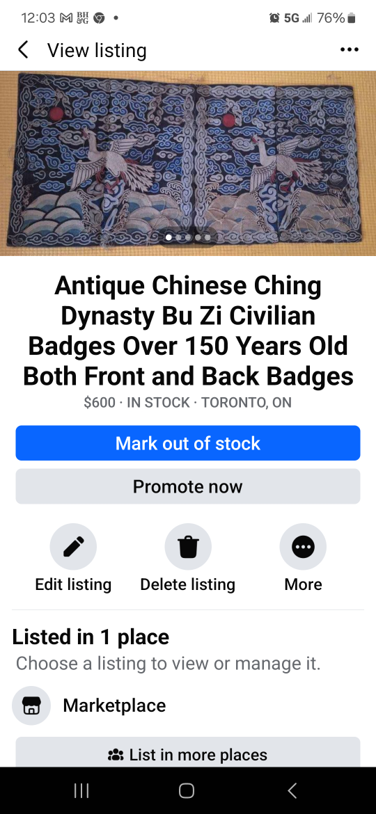 Antique Chinese Ching Dynasty Bu Zi Civilian Badges