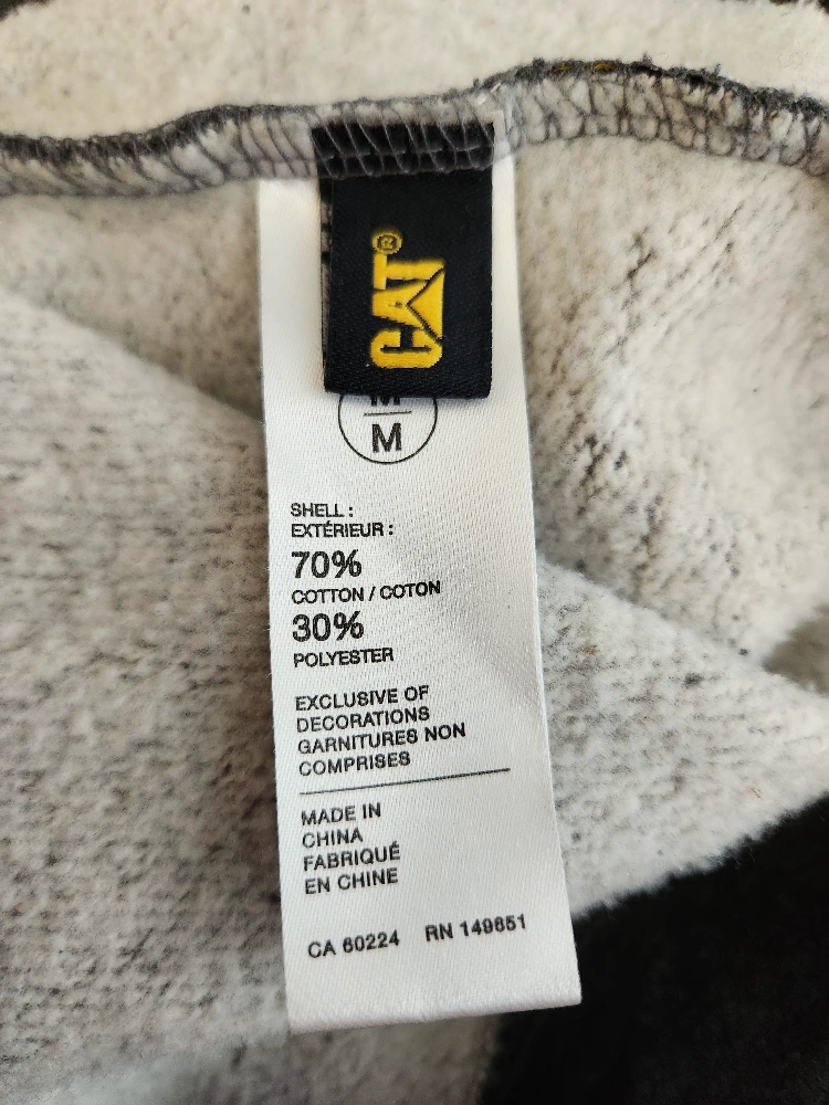 Grey hoodie with a large yellow CAT logo. The hoodie has a pouch pocket and a hood with drawstrings. With a Cat Laptop Backpack 2 for the price of 1