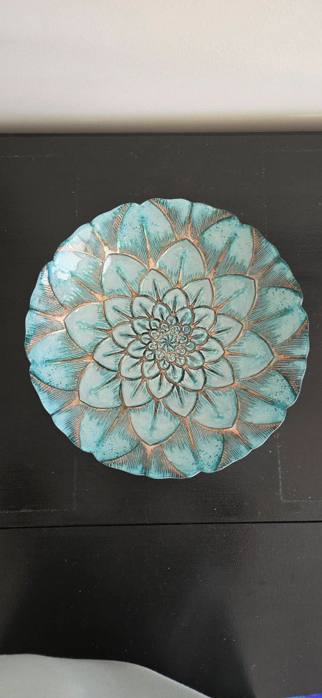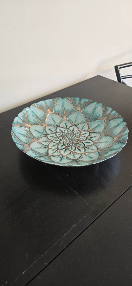This is a beautiful glass bowl with a floral design. The bowl is large and would be perfect for a centerpiece or for storing fruits/vegetables. It has a iridescent finish. The measurements of the bowl are 13" diameter. Originally purchased from HomeSense. Pick up only Cash only Please check out my other listings :)