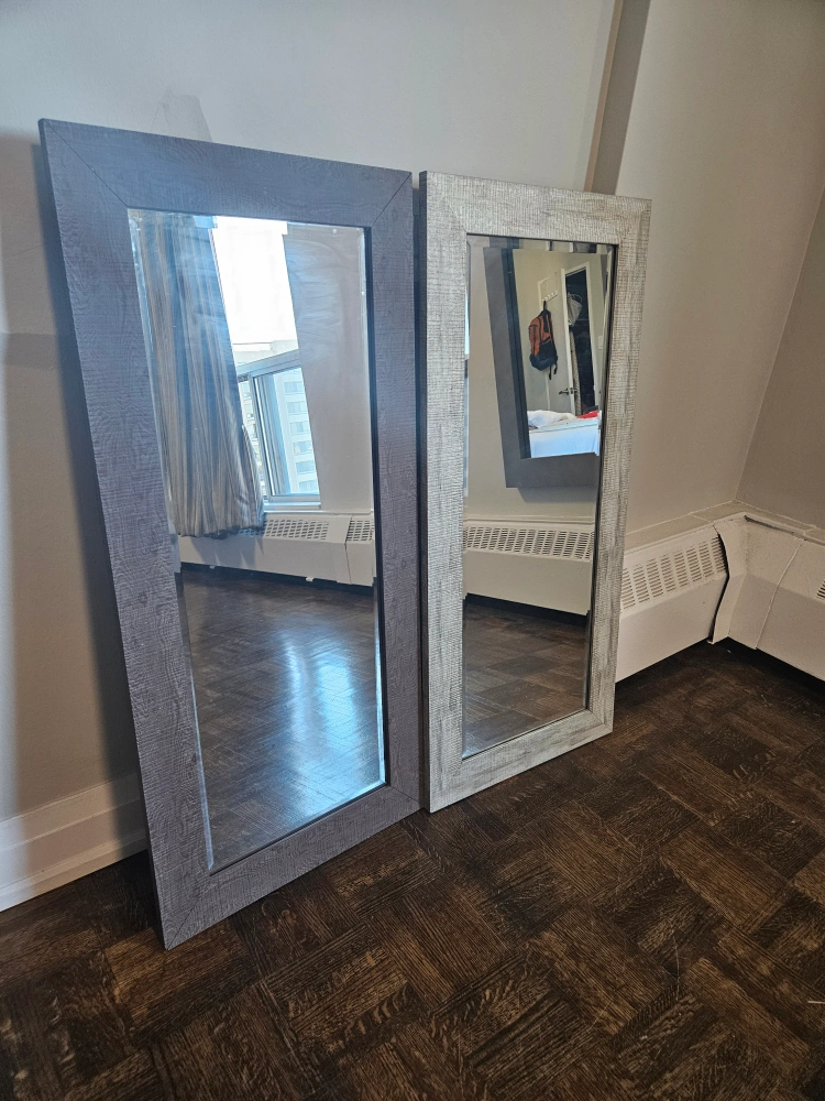 Both for $20. Two grey wooden framed mirrors, each with a different shade of grey. They can be hung vertically or horizontally. Move out sale. Great condition. PET FREE SMOKE FREE! PRICES REFLECT CONDITION AND TIME OF USE. PICK UP ONLY NEED GONE ASAP! Check out my other listing. Maybe you'll find what you need at a very convenient price!