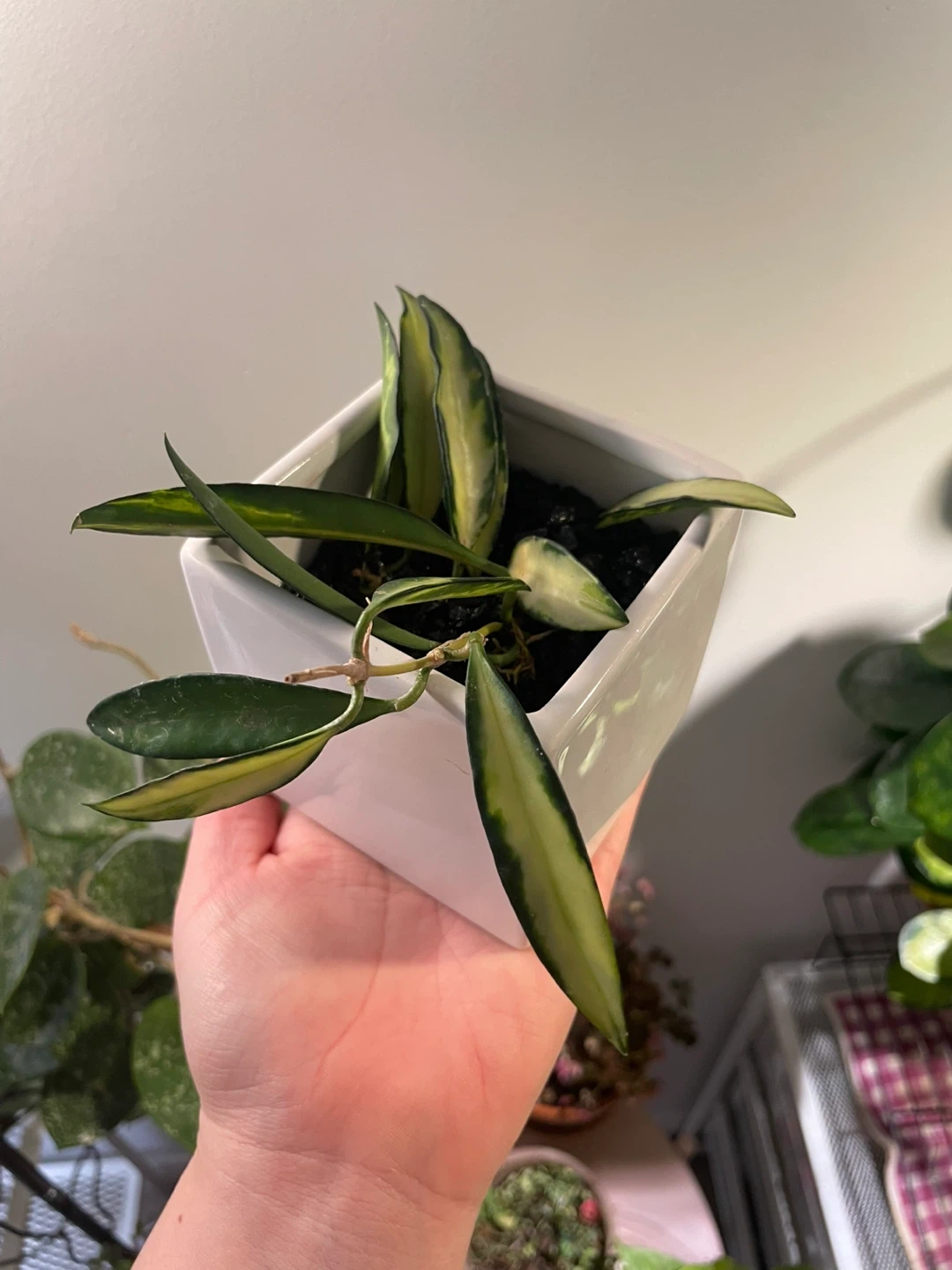 This is a variegated Hoya wayetti plant in a white pot. It features striking green and yellow striped leaves. This plant thrives in bright, indirect light.