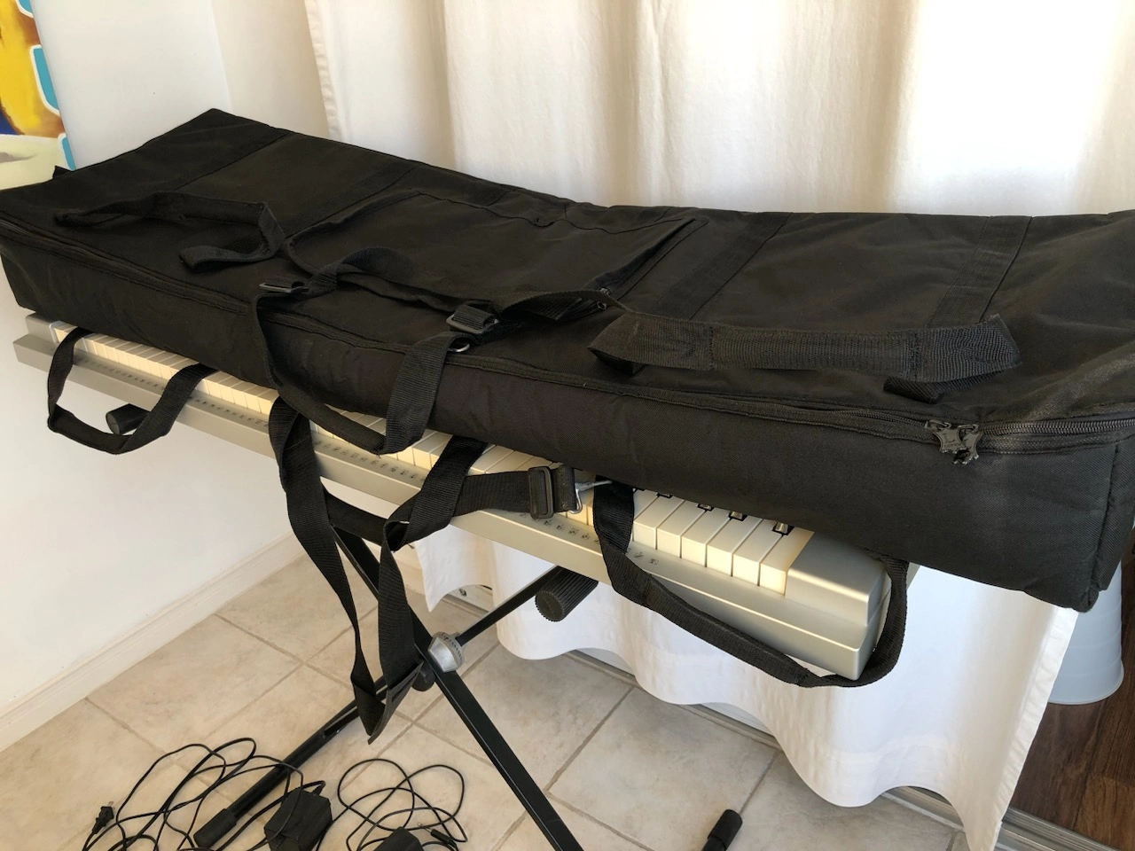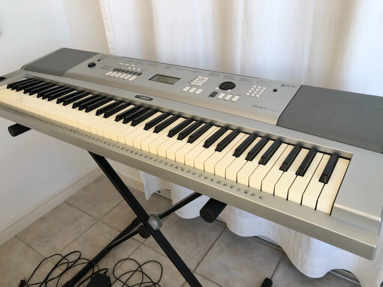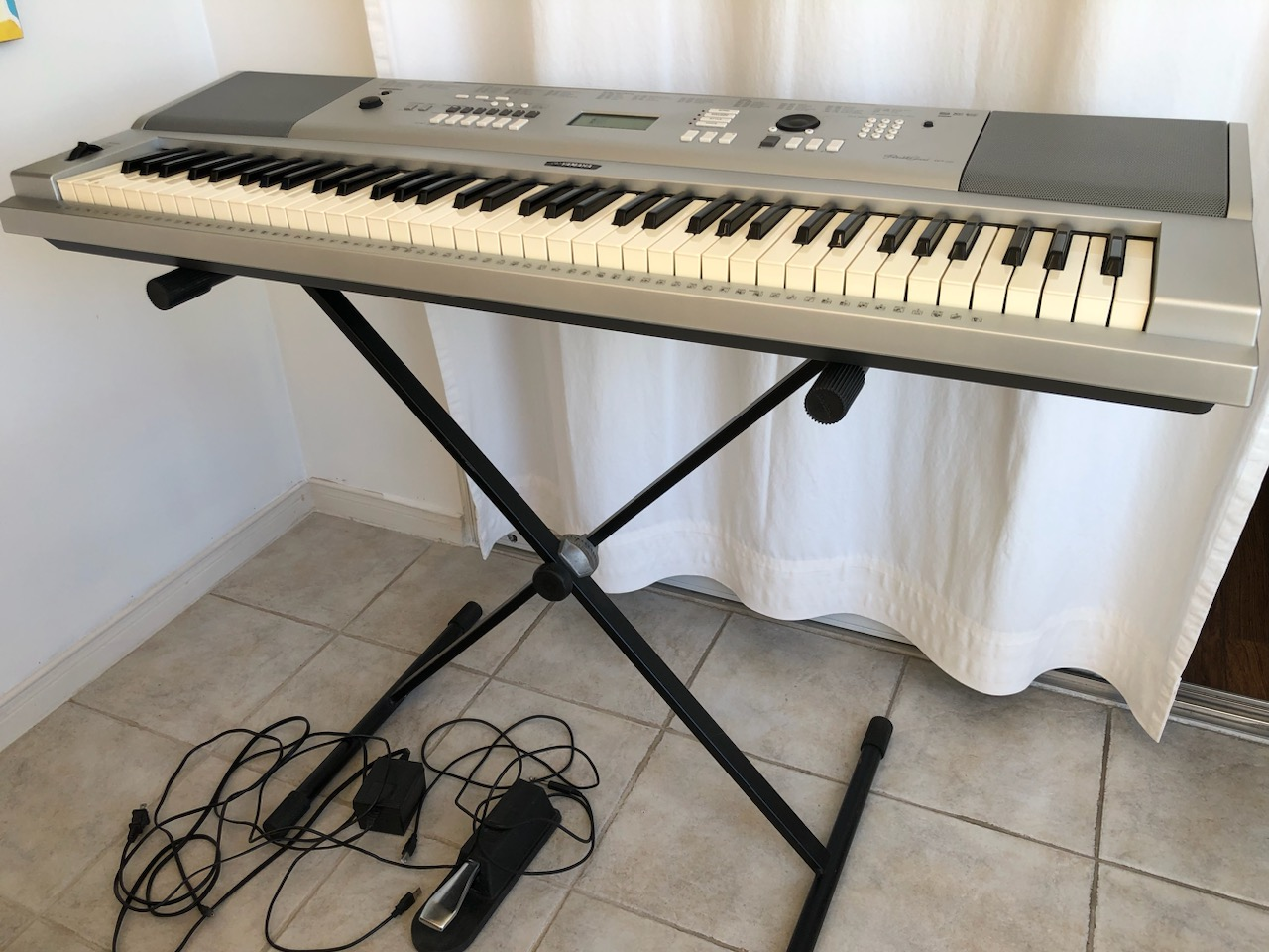 Yamaha DHX 220 Keyboard with stand, weighted keys,foot pedal, midi cable and power adapter. Includes soft padded case.
