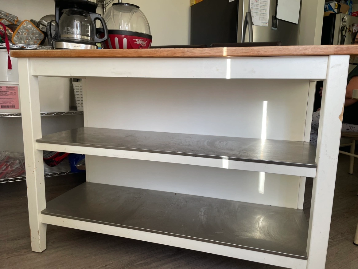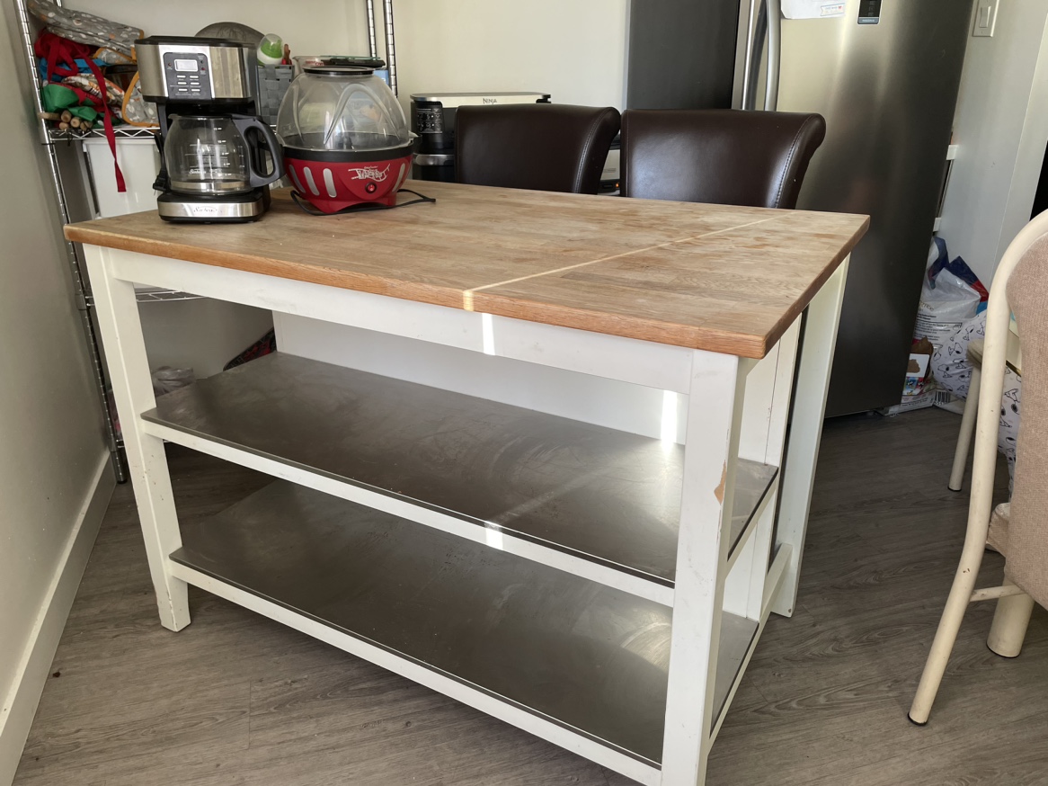 White kitchen island in great condition with wooden top and 2 stainless steel shelves. Asking $250 (cash only please)