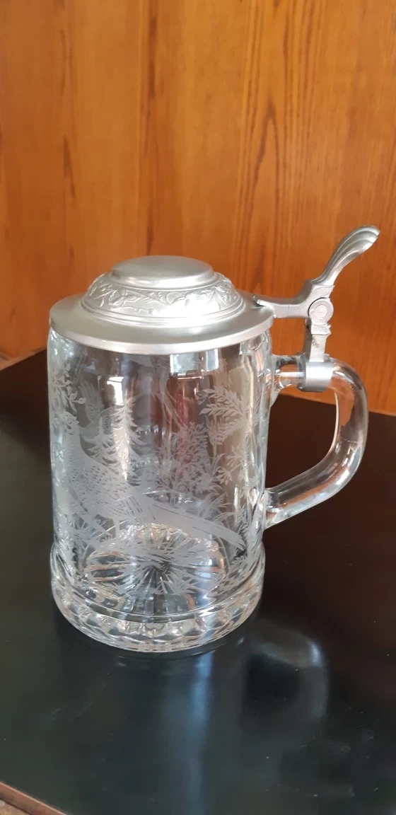 810Glass beer stein with pewter lid and handle Features beautiful etched glass design Made by Alwe of West Germany