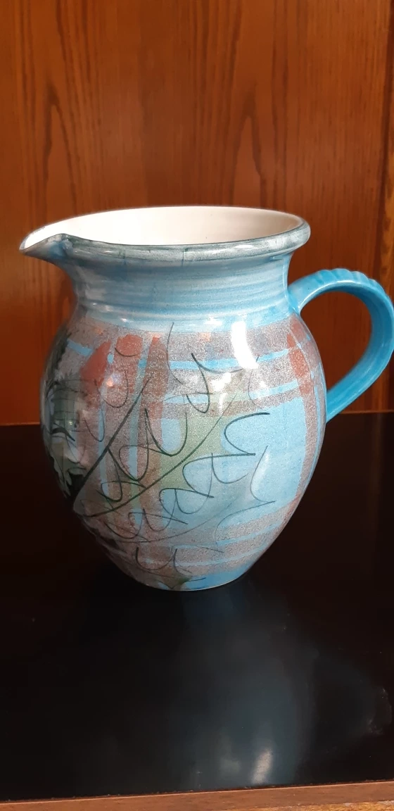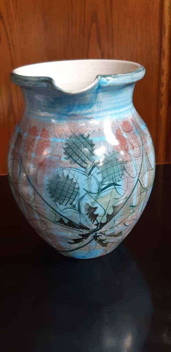 848Lovely blue pitcher with green and red design By The Tain Pottery of Scotland Can also be used as a vase