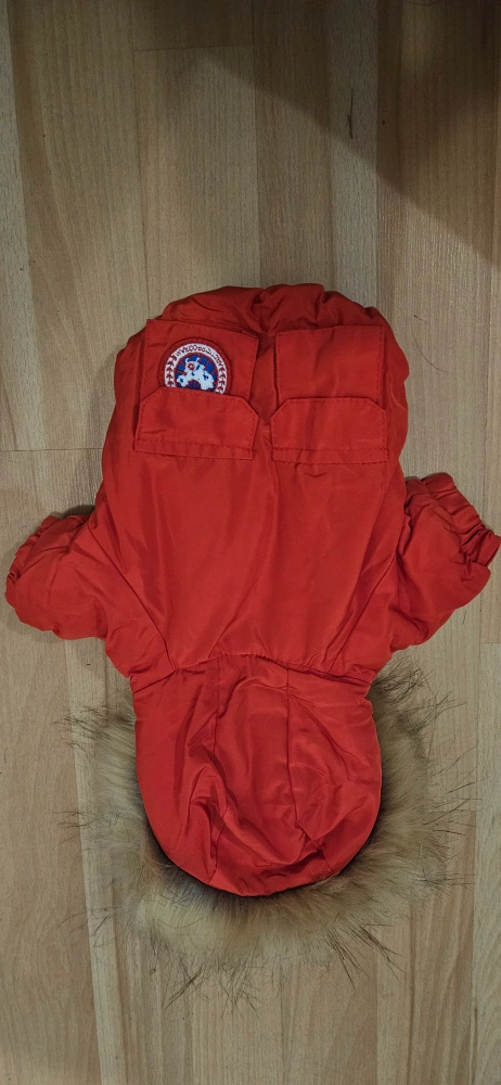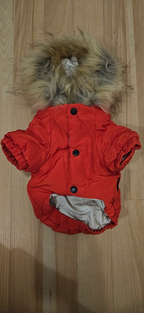 Red dog coat with fur trim hood and a pocket on the back. Size M.