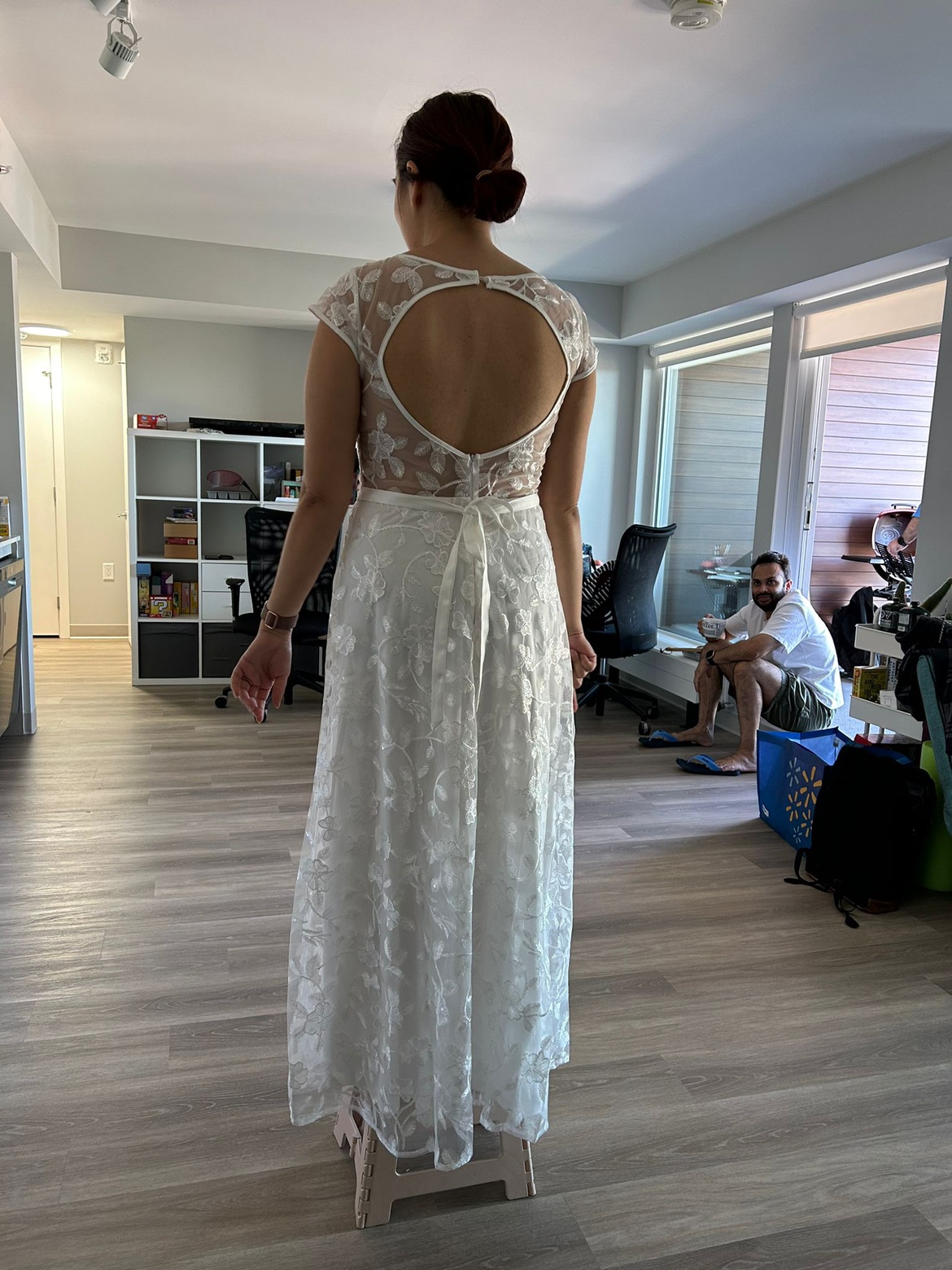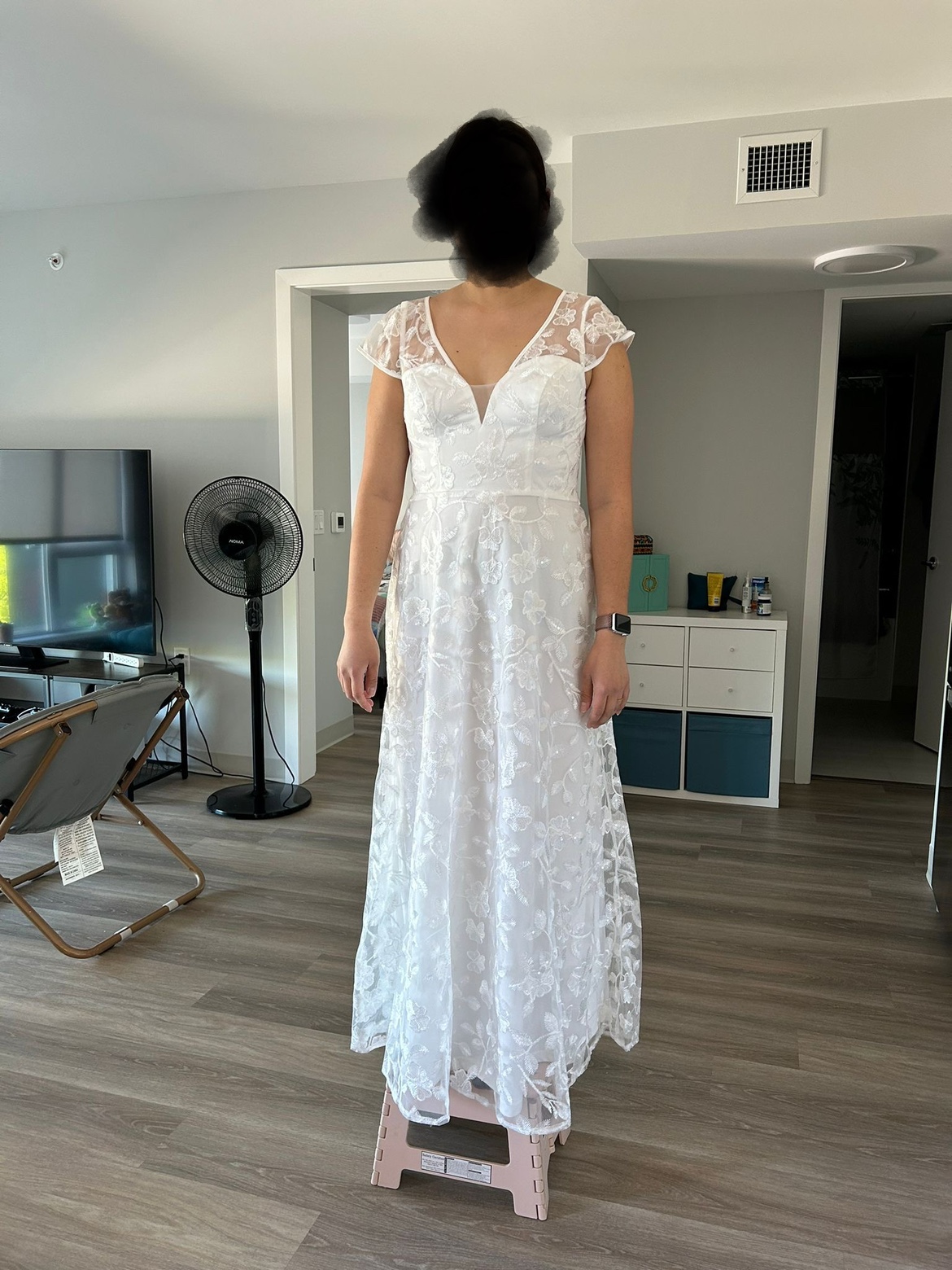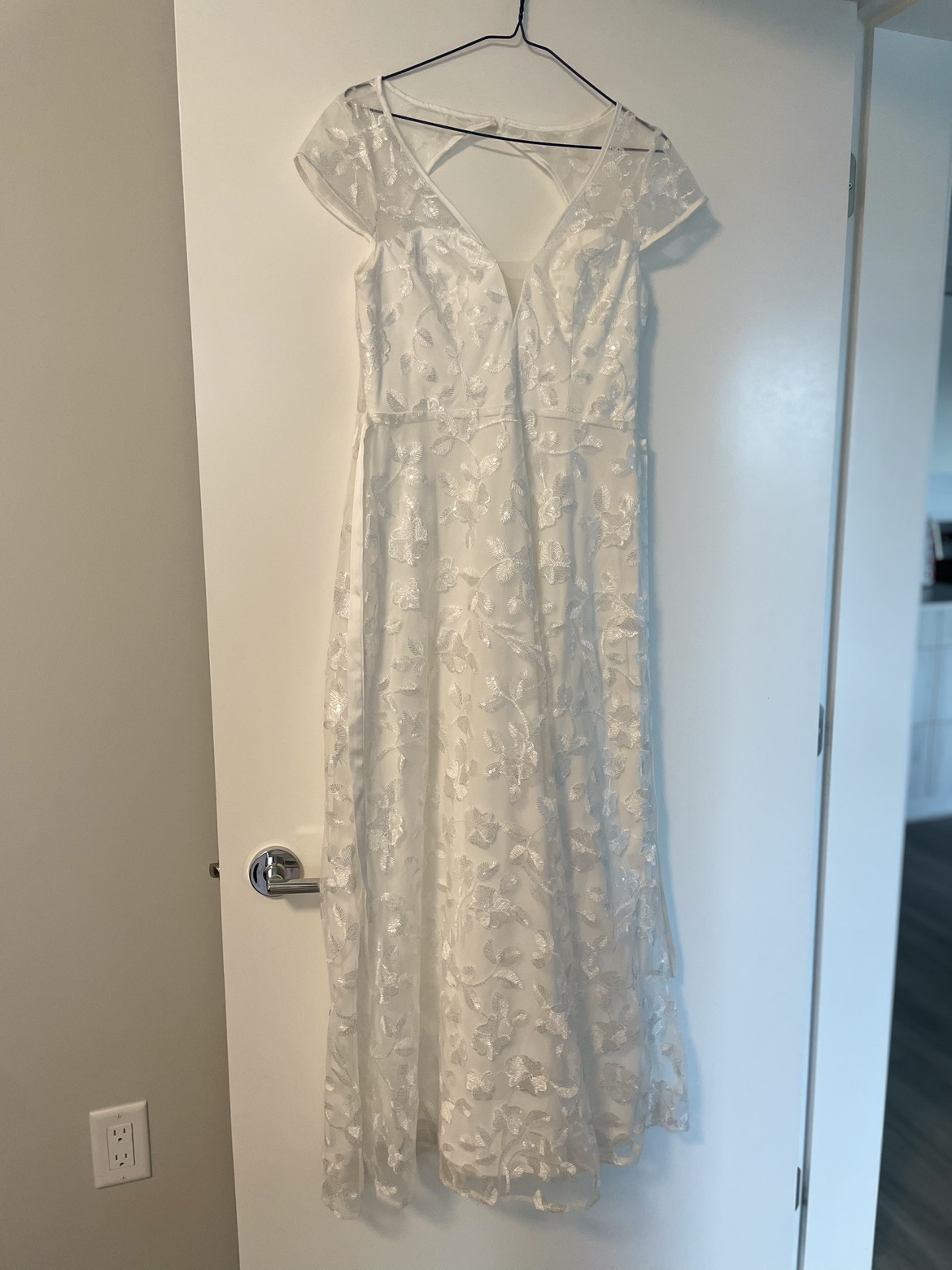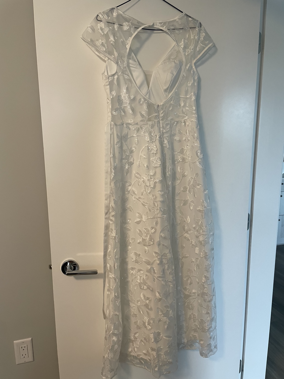 Size 6 (M) but i am actually size 8 and it fit me perfectly. Selling as i went for another option at the end. SHEIN Belle Romantic Embroidered Wedding Dress With Deep V-Neck And Tied Waist For Women