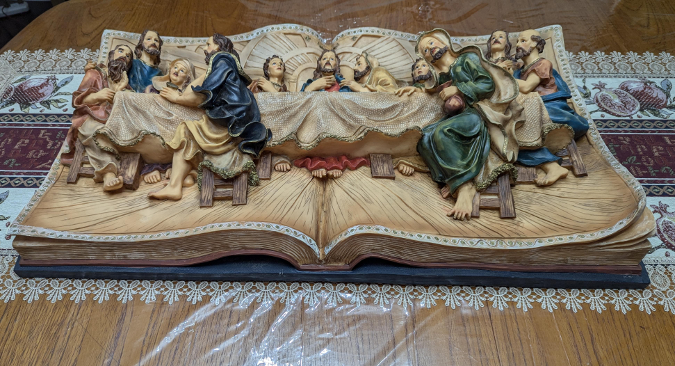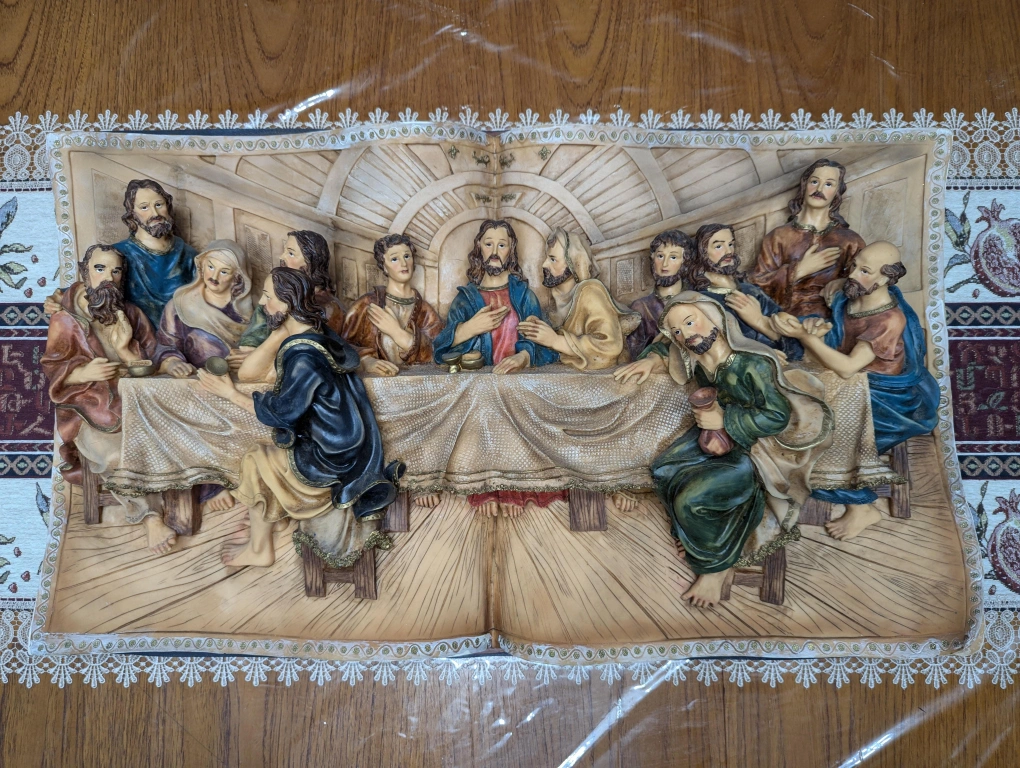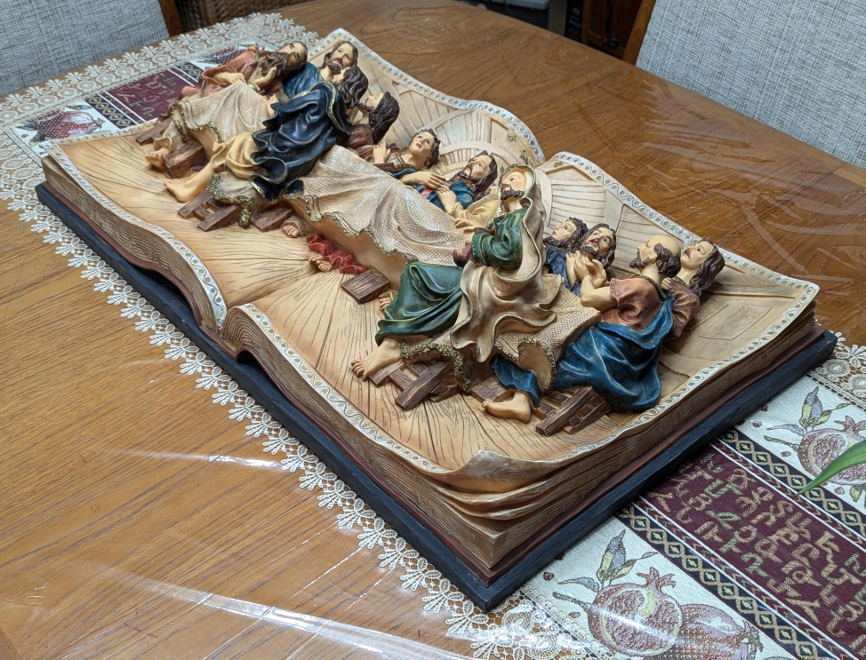 A 3D wall plaque or tapletop of the Last Supper scene. The plaque is in the shape of a book with the scene raised from the book pages.