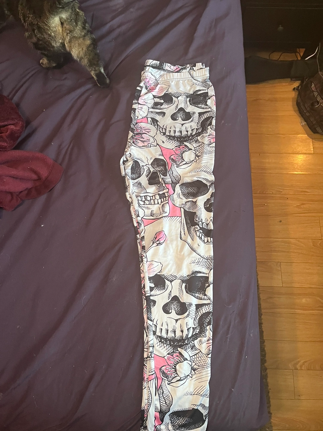89Leggings with a skull pattern. They are a size Large. Worn once ..wash been sitting in leggings drawer ..to big. Now washed and ready to go Pet friendly /ns Porch pu