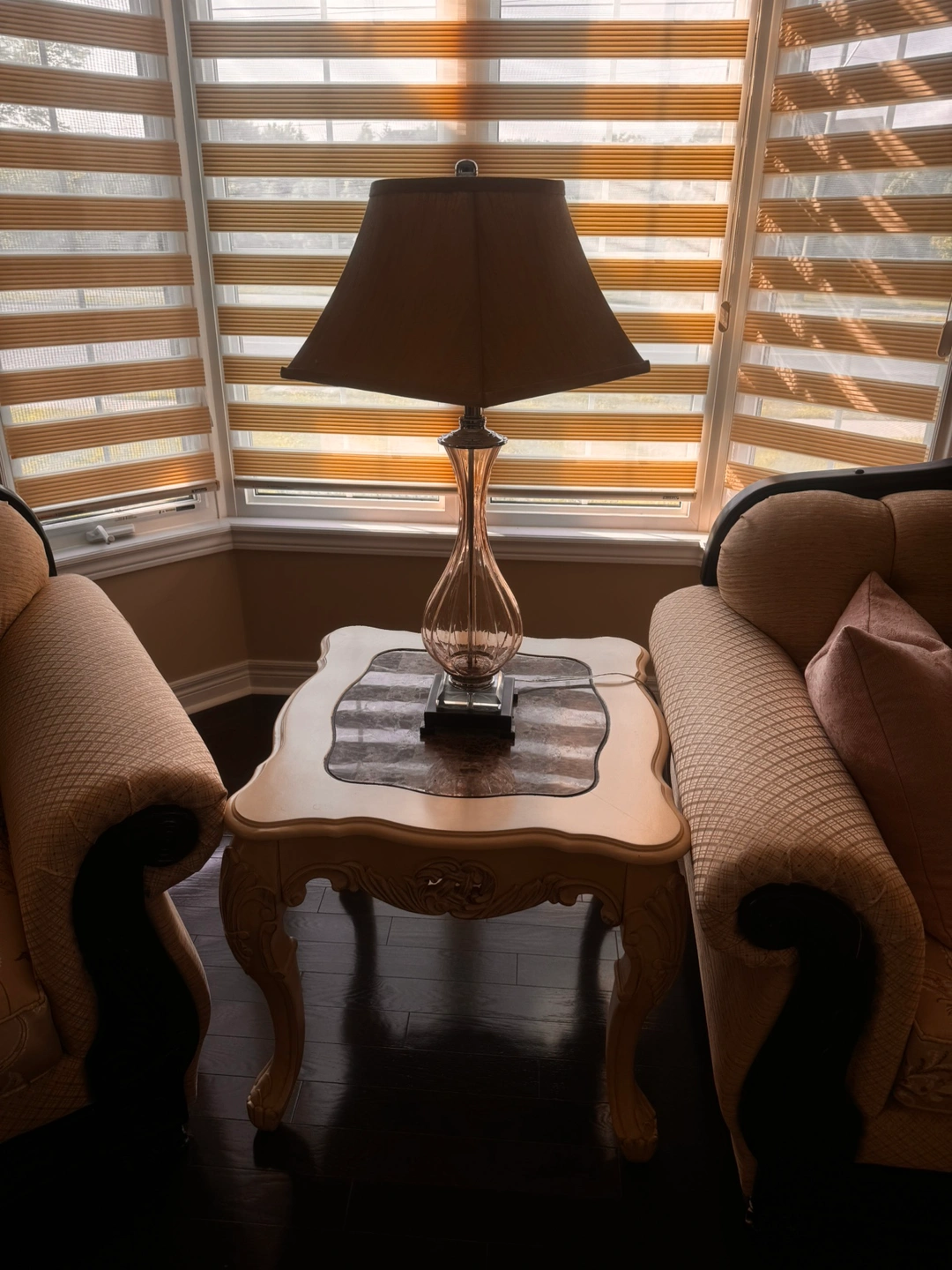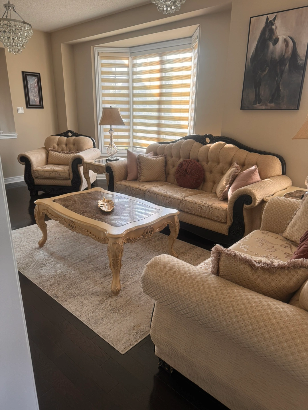 This living room set of 3 includes a sofa, two armchairs, a coffee table, and two end tables. The set is in good condition and has been well-maintained. The set would look great in a traditional or formal setting.