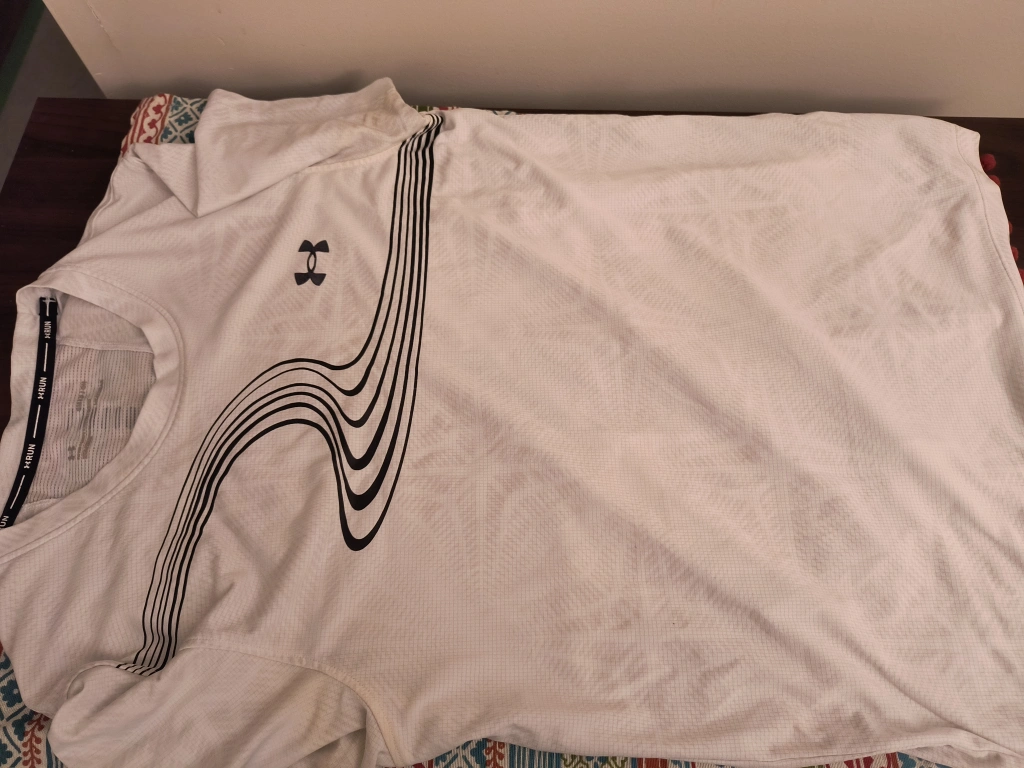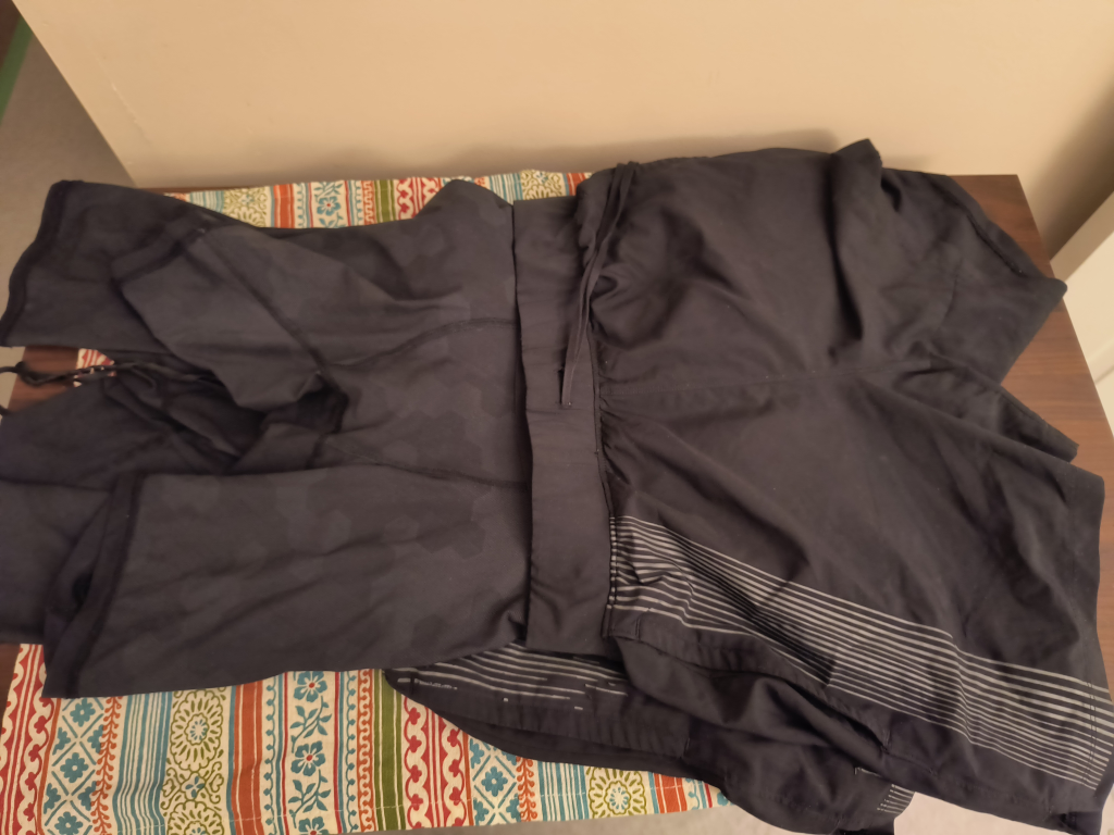 1 White running shirt with black graphic-size SM/P/CH, and 2 black running lined shorts with grey trim-size M. 3 pieces in total.