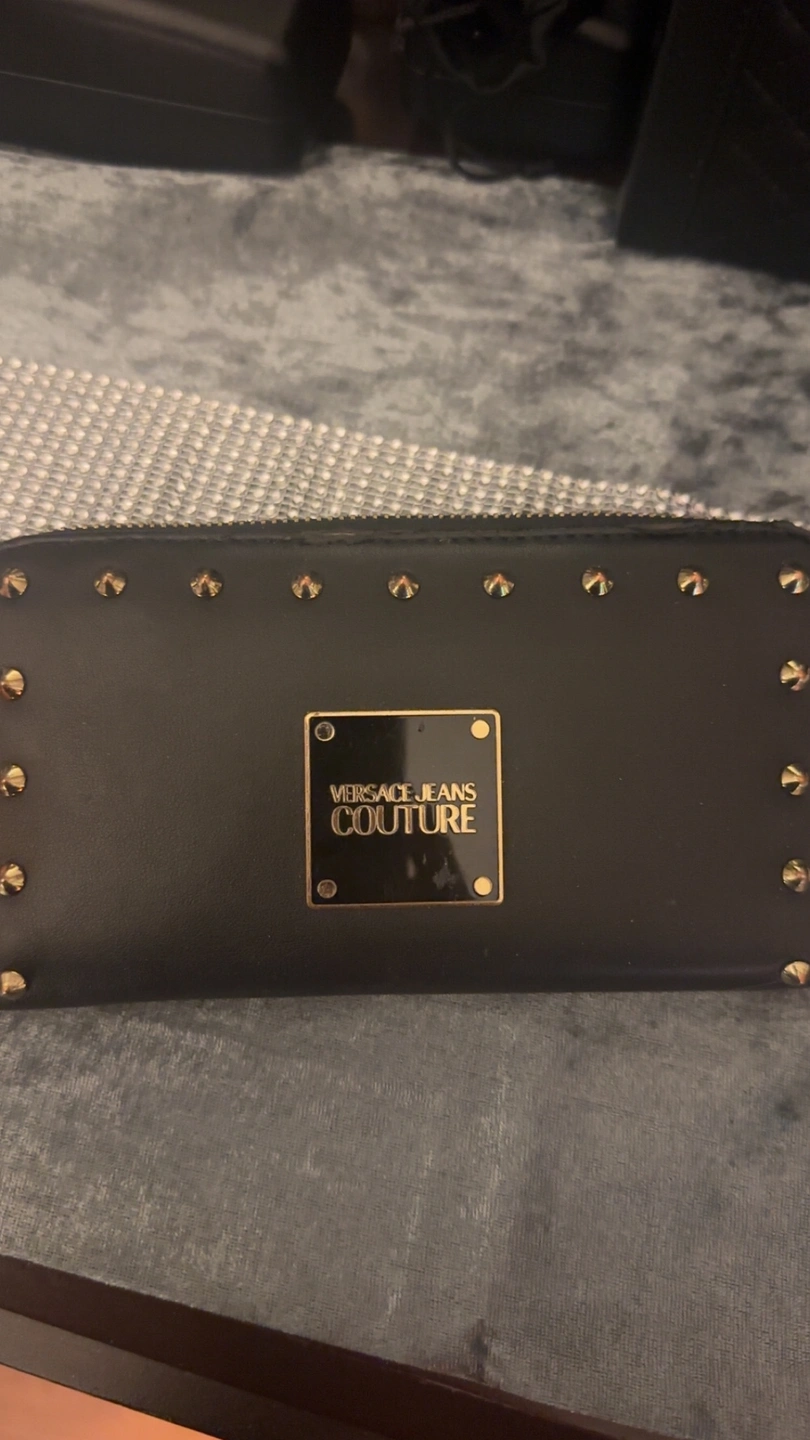 32Black studded wallet with a gold zipper and gold Versace Jeans Couture logo.
