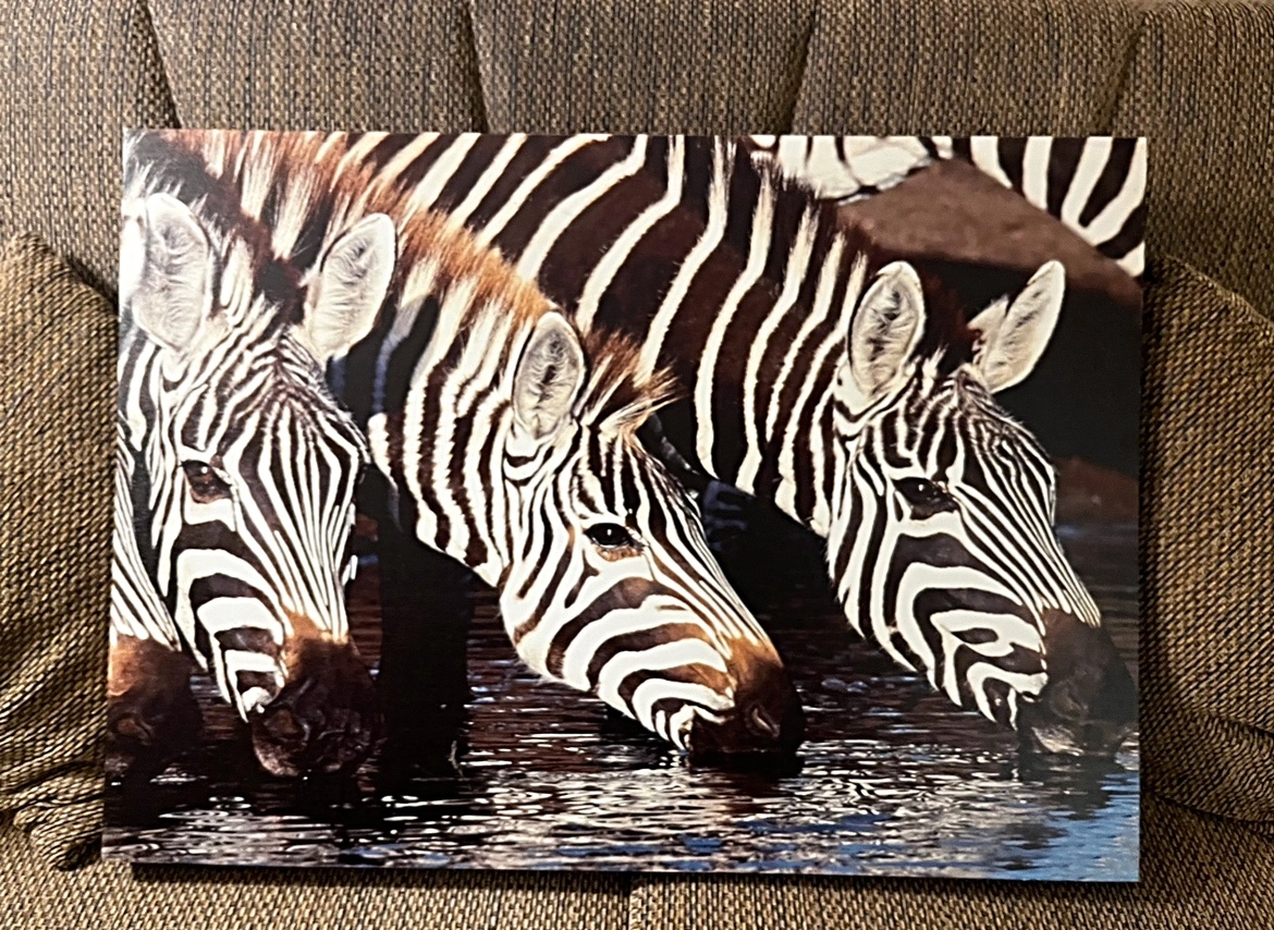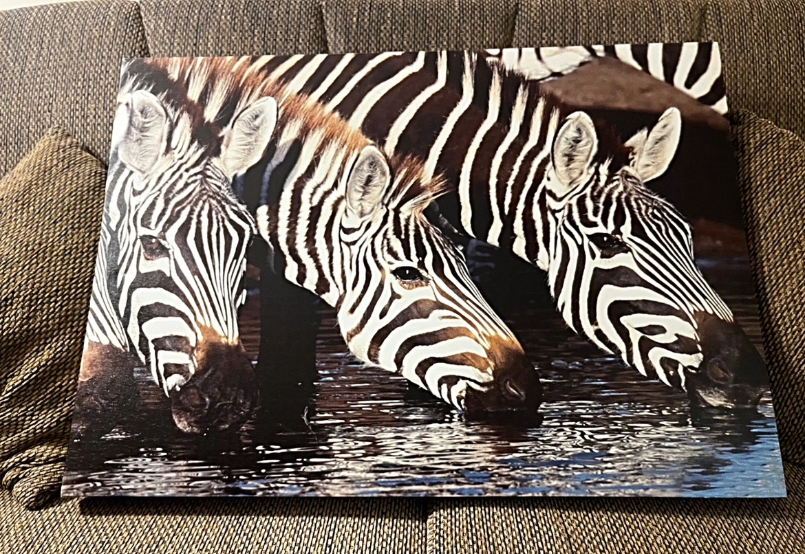 A canvas painting of three zebras drinking from a water hole. The painting is framed in a wooden frame. Beautiful black and white canvas picture of zebras. Perfect for any room in your house! In great condition, I’m only selling them because I have nowhere to put them unfortunately.