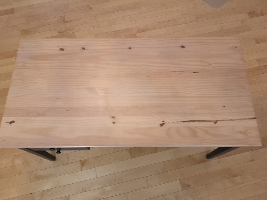 A functional writing desk featuring a light wood top and black painted legs. The desk has two drawers located on the left side.