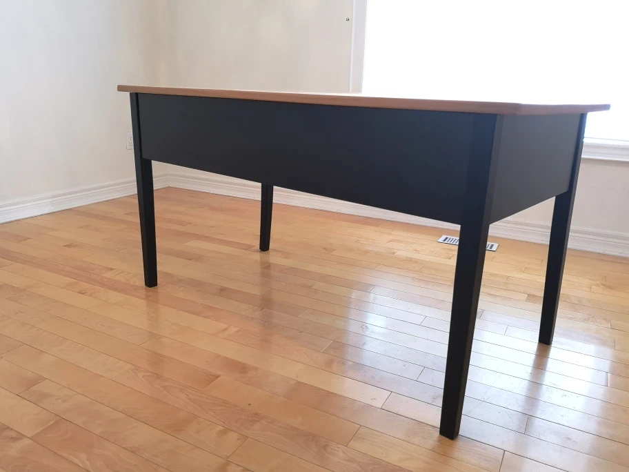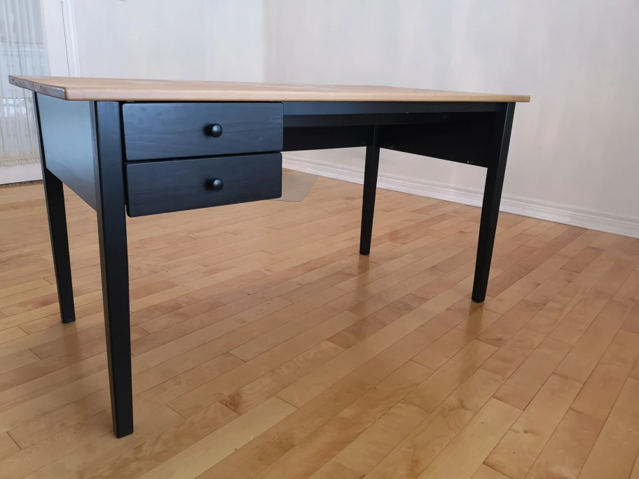 A functional writing desk featuring a light wood top and black painted legs. The desk has two drawers located on the left side.