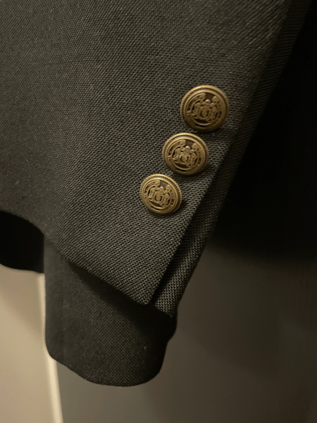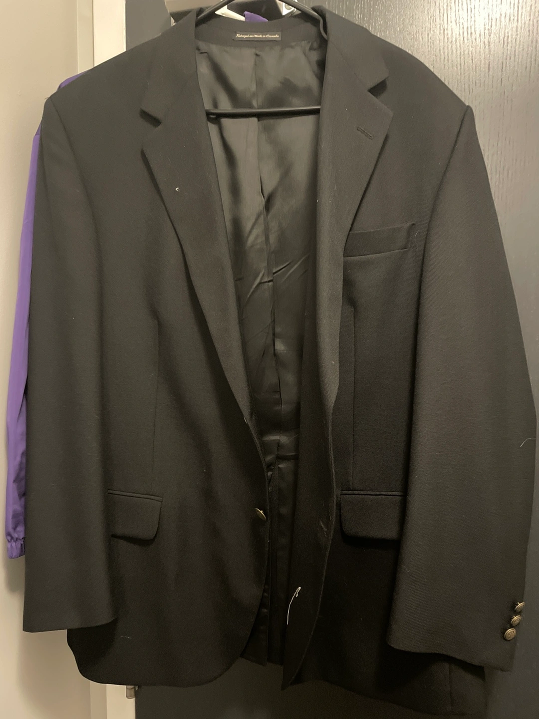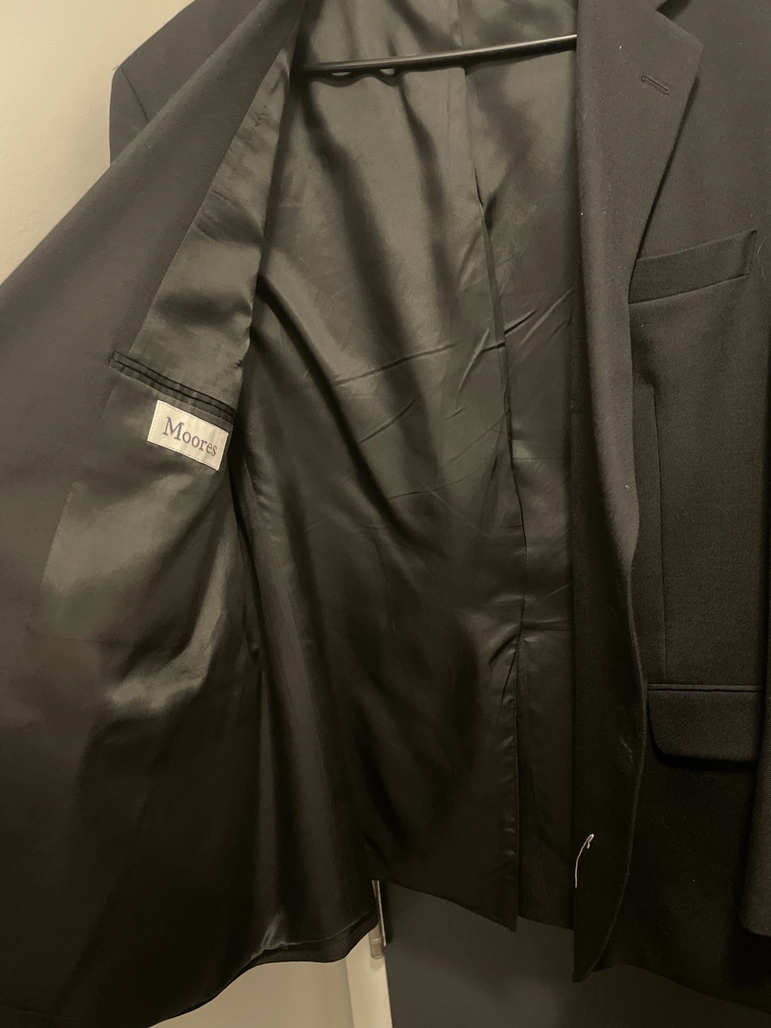 Men's Moores black blazer, size 46L. Made in Canada. Features four brass buttons on each cuff. Classic style, perfect for formal or business casual occasions.