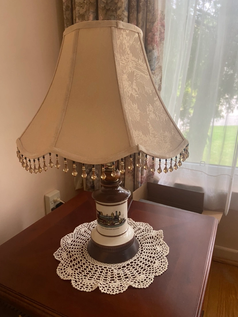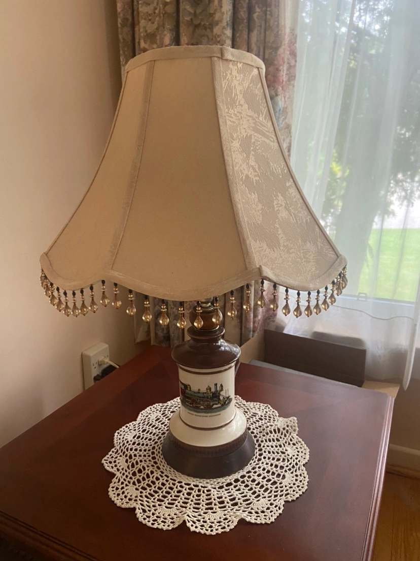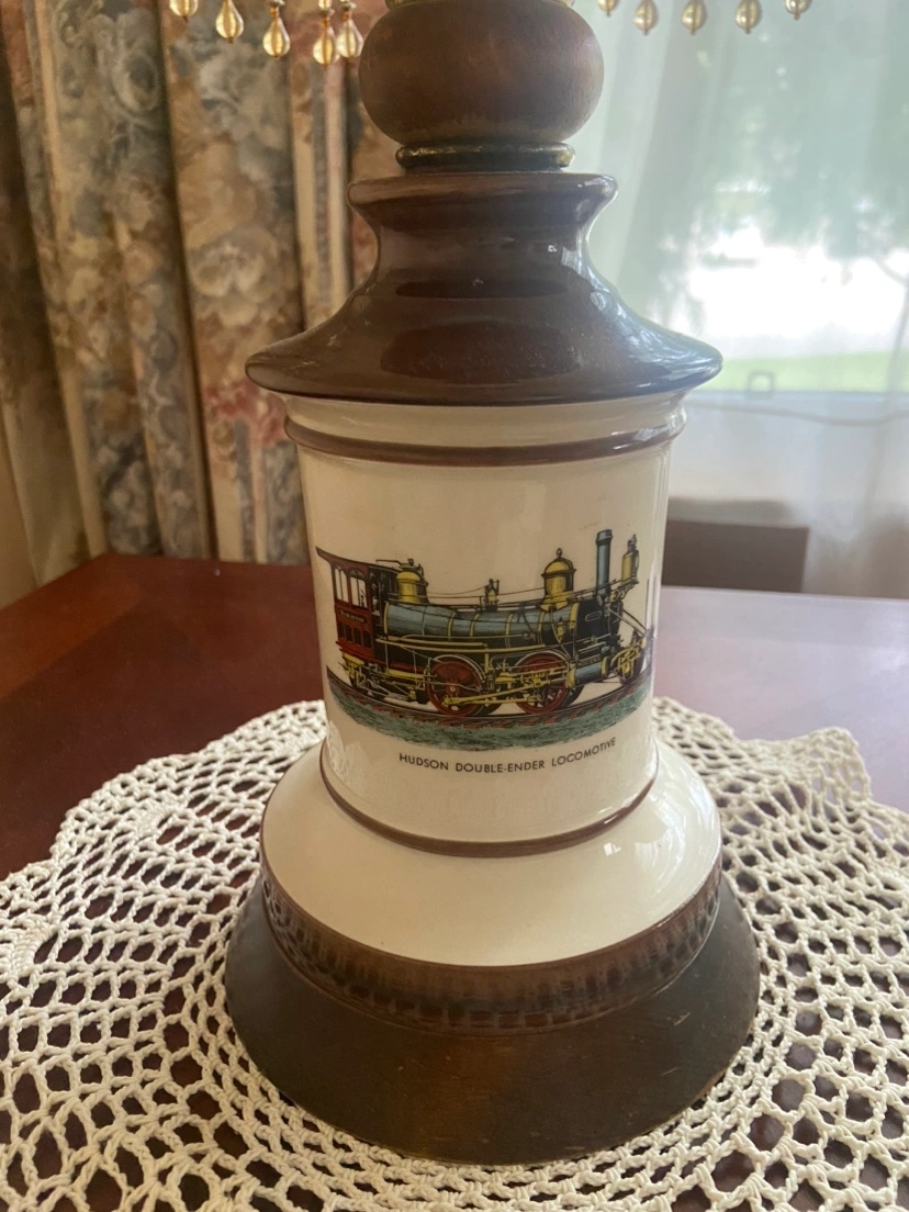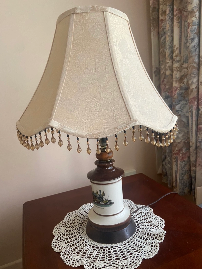 Vintage table lamp that features an image of a Hudson Double Ender Locomotive, a beige lampshade with beaded trim, and a ceramic and wooden base.
