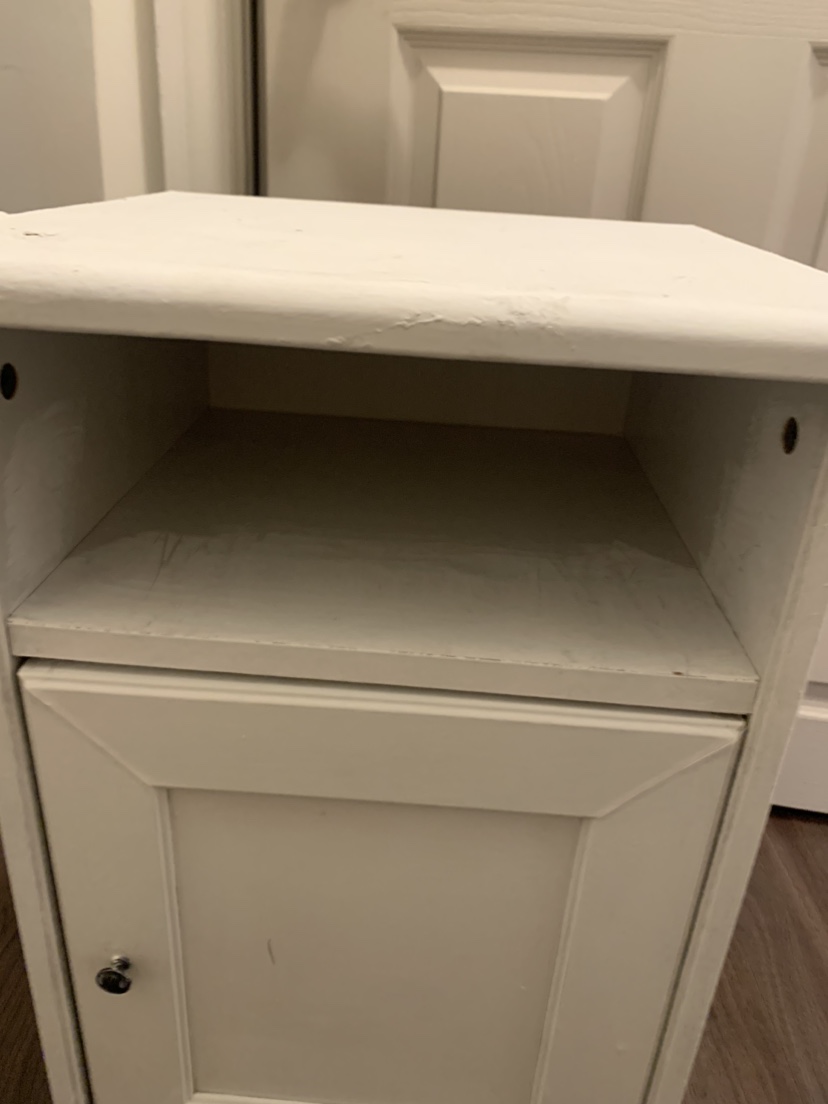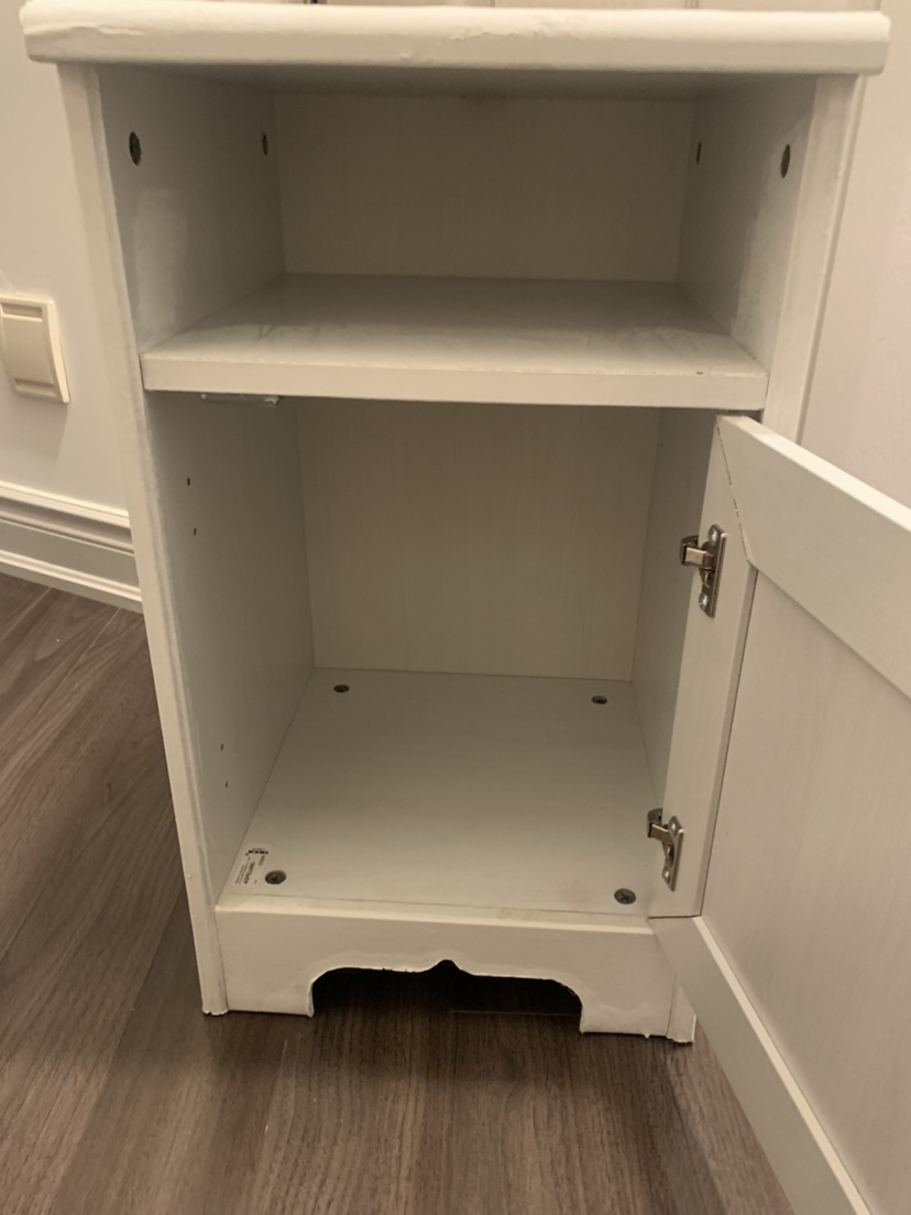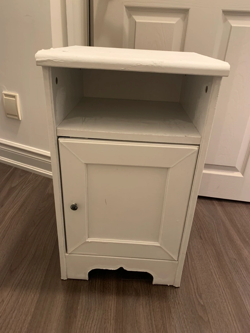 Small white nightstand with one shelf and one cabinet. Approximately 12 inches wide.