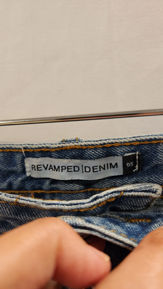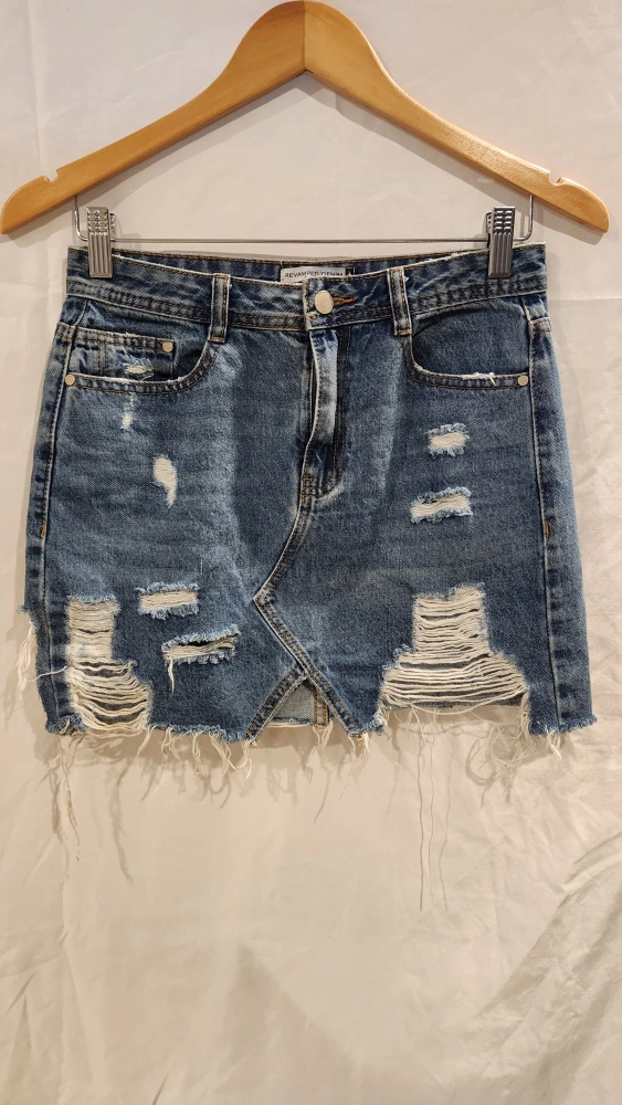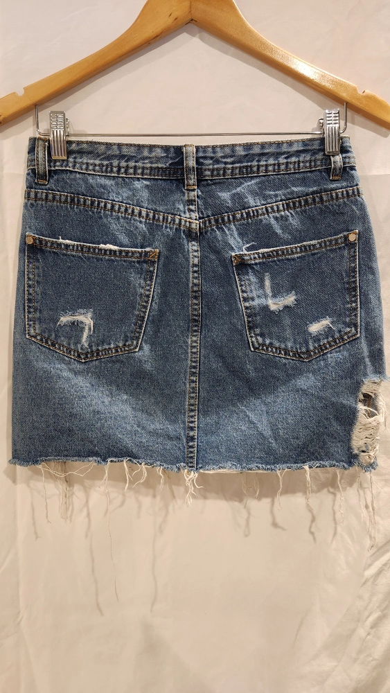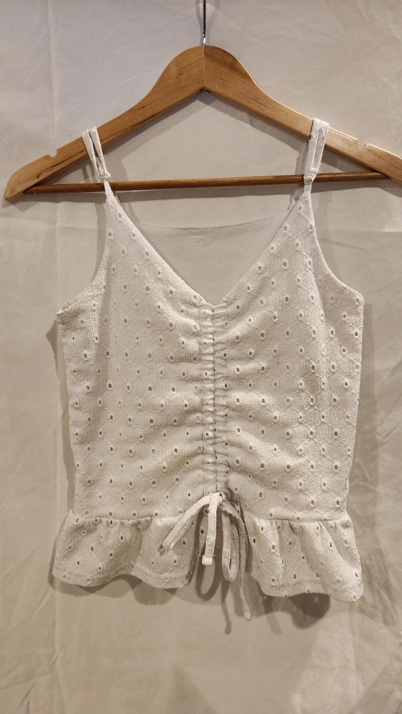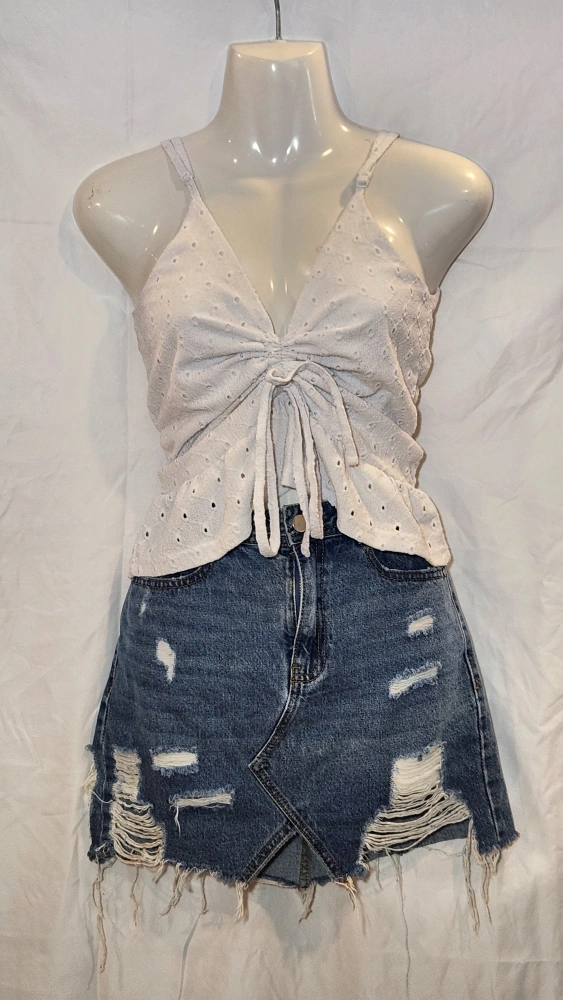 white eyelet top with an adjustable cinched detail on the front and a distressed denim mini skirt.
