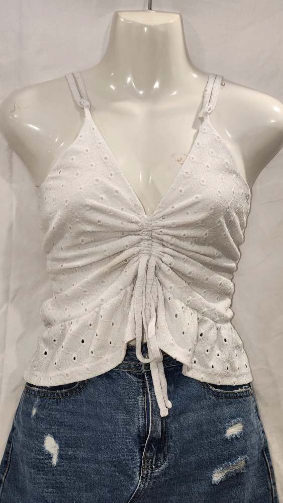 white eyelet top with an adjustable cinched detail on the front and a distressed denim mini skirt. white top - noisy may, small denim skirt - revamped, size 5 $10 each take both for $15 Barrhaven area close to Home Depot Cash and pick up