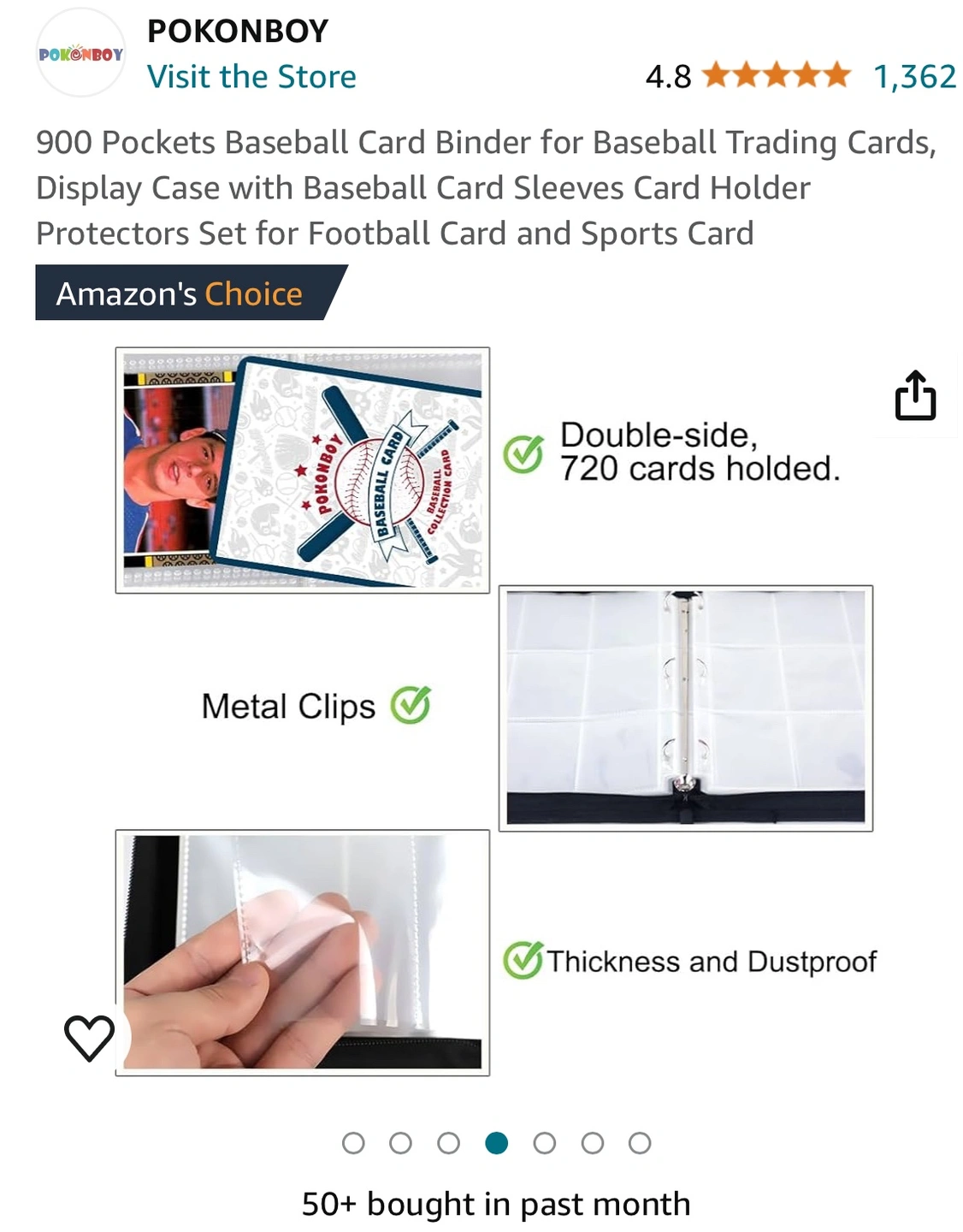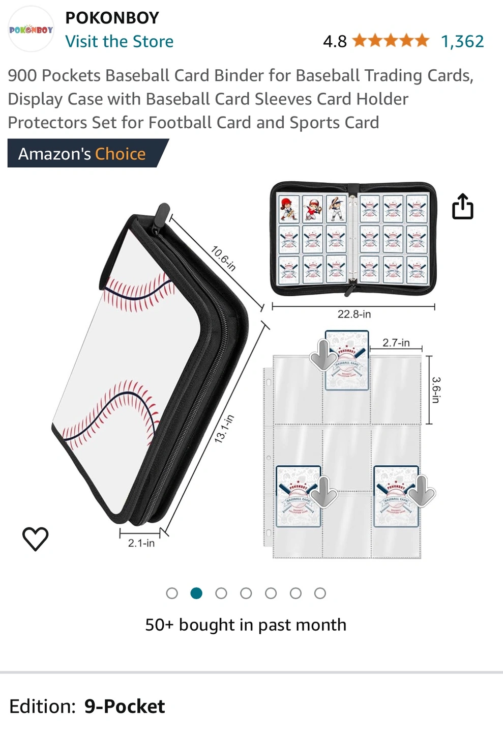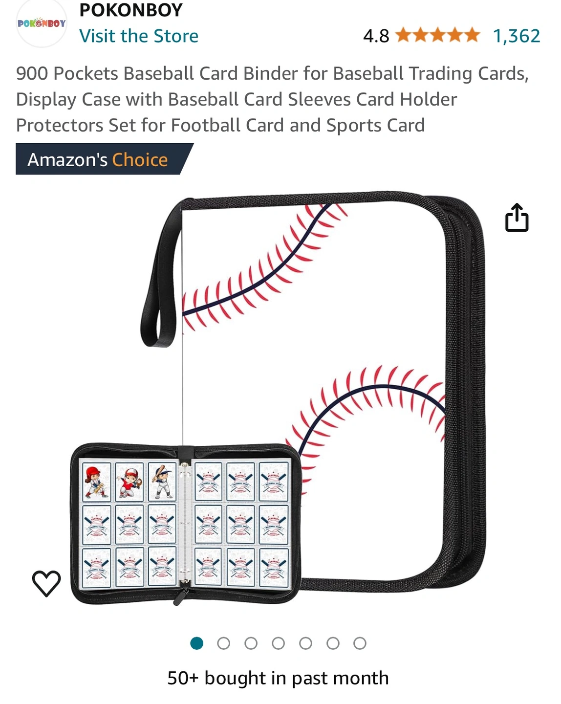 This binder holds 900 cards and includes card sleeves. It features a baseball design and a zipper closure. The binder is portable and made of waterproof PU material.