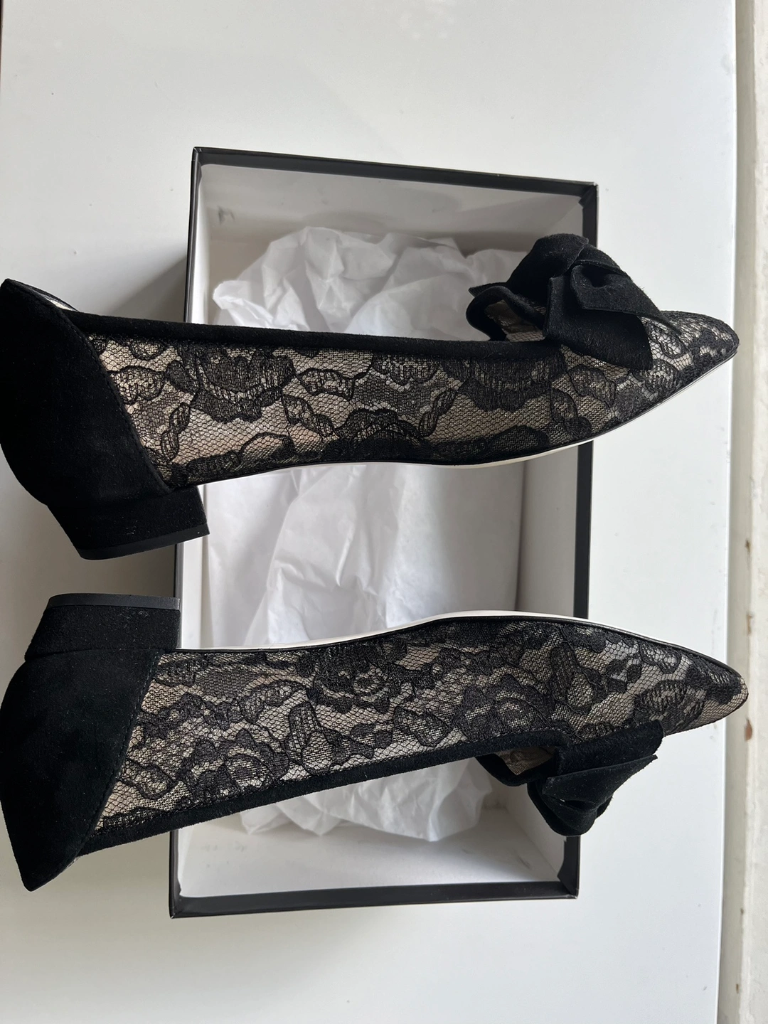Ron White ballerina flats in black suede and black lace with a bow detail. In original box. Never worn , really elegant. Open to offers.