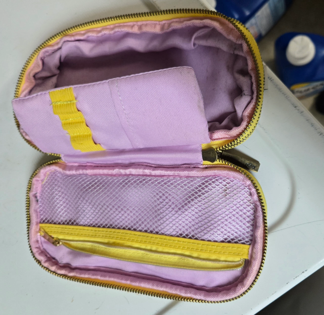 A purple and yellow pencil case with a zipper closure and multiple compartments. The zipper allows it to expand to fit more inside