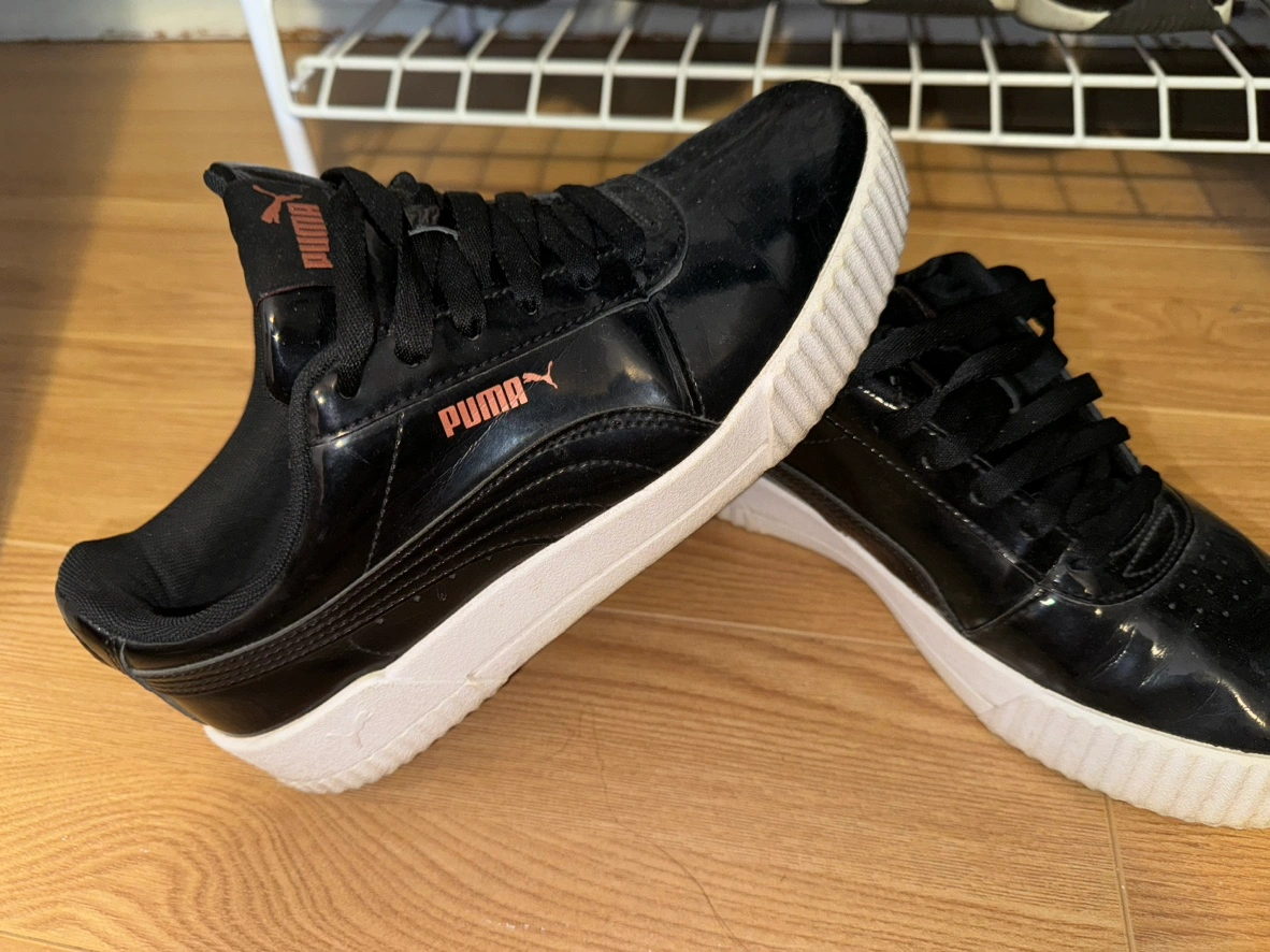 Black patent leather Puma sneakers with white soles. Size 7. Lace-up. Rose gold Puma logo. Great for everyday wear.