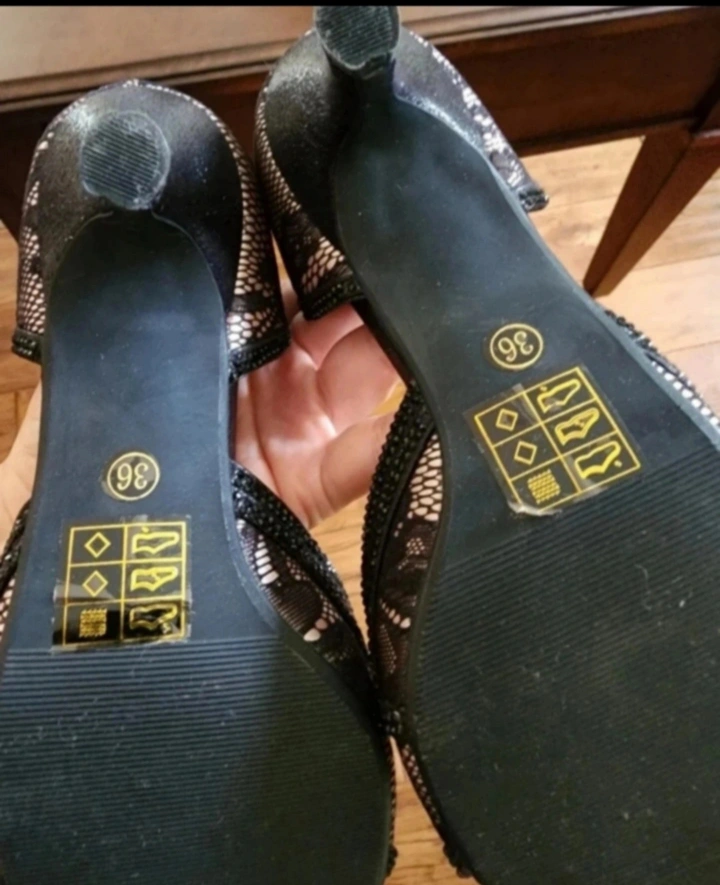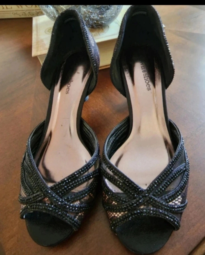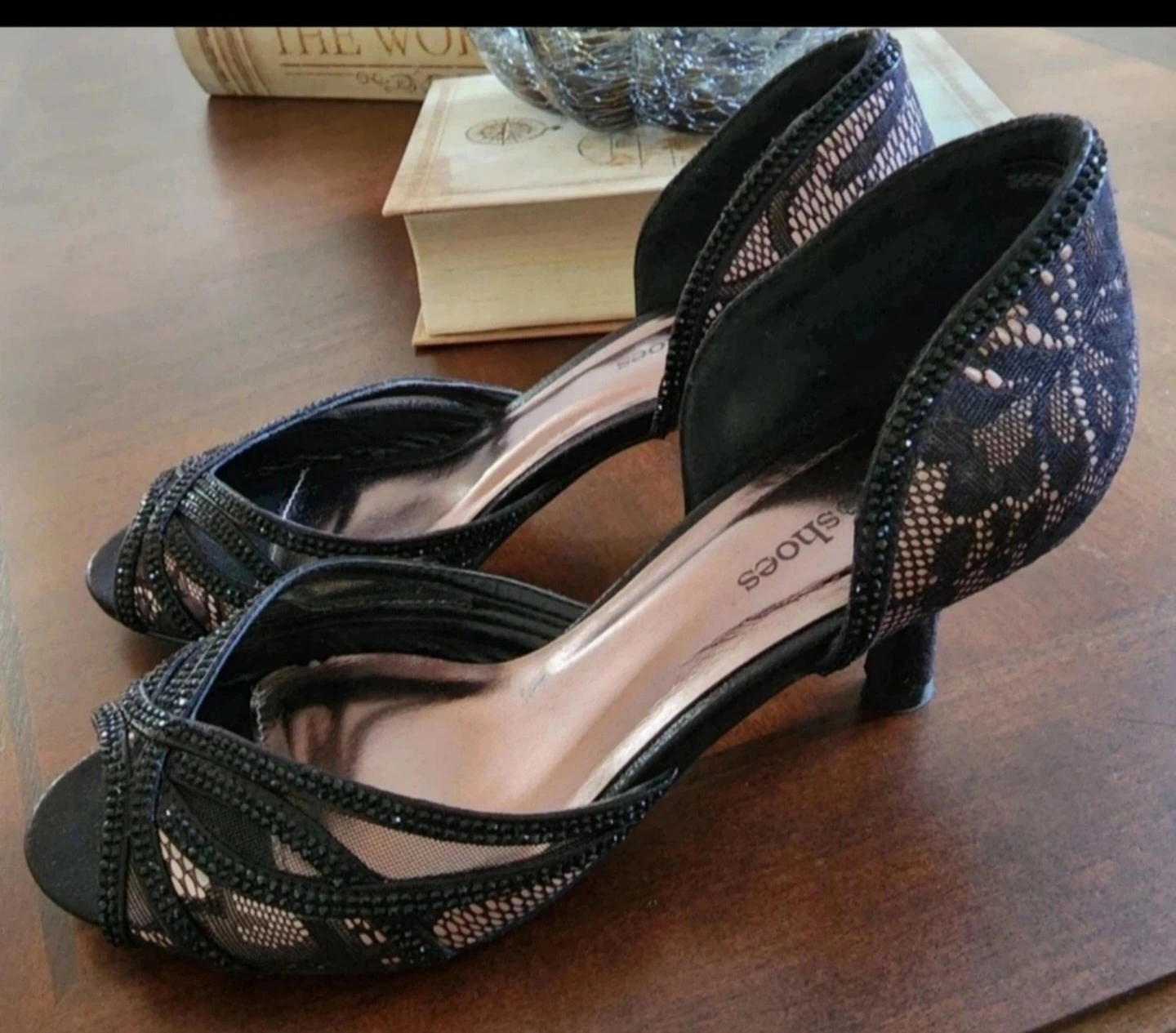 Like new lacy black kitten heels with rhine stones. Only worn for a few hours indoors. Very comfortable.
