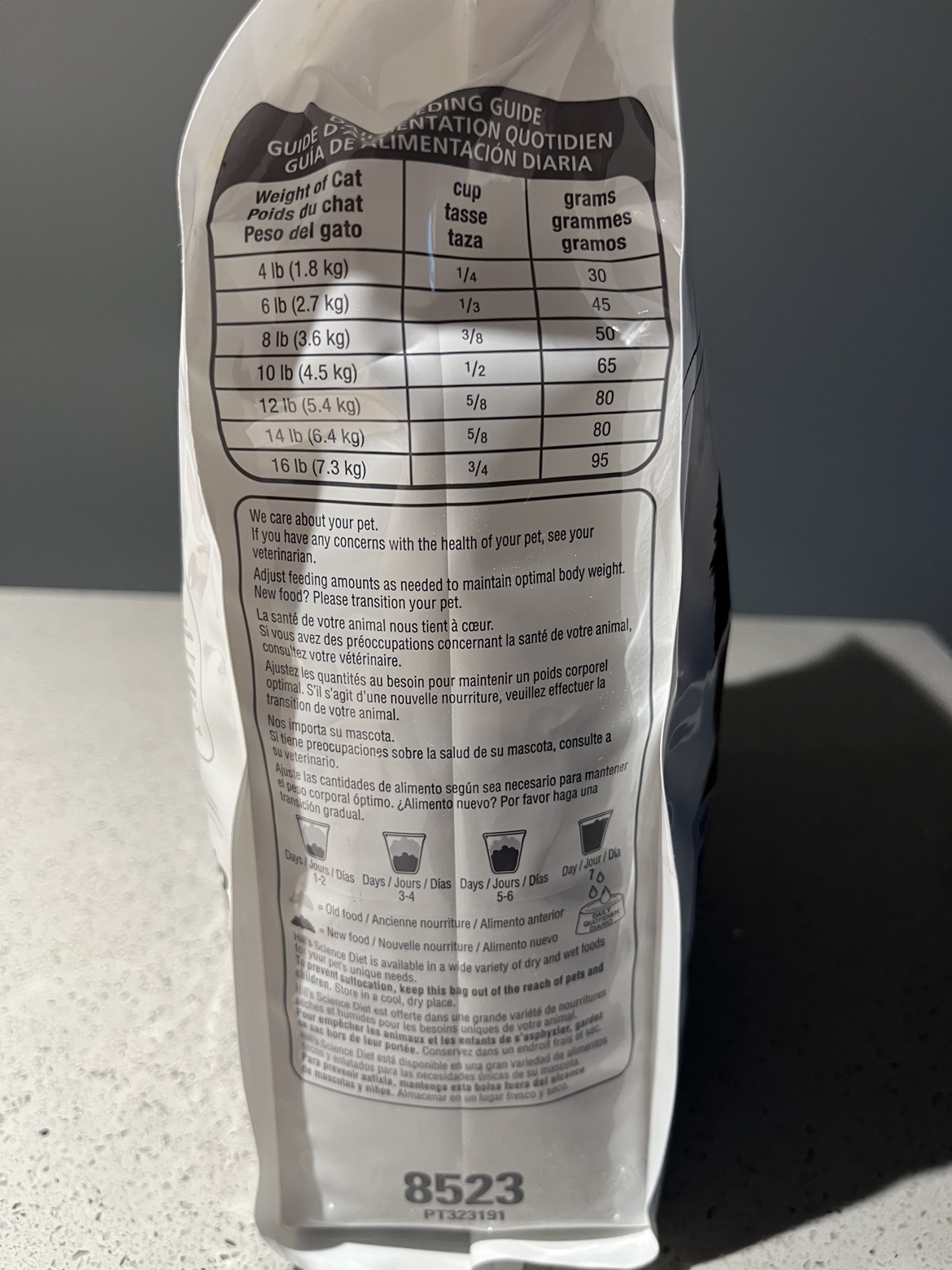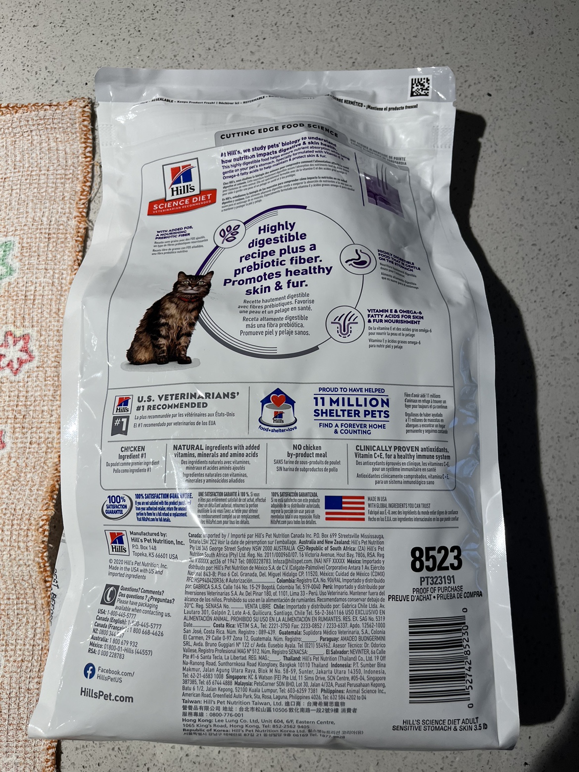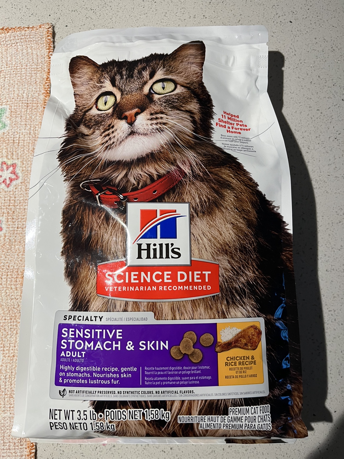 This is a bag of Hill's Science Diet Sensitive Stomach & Skin Adult dry cat food. Unopened, our vet changed our diet. Can’t return.