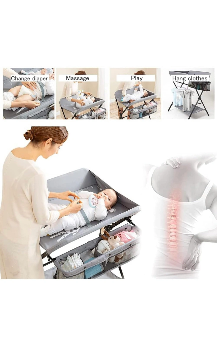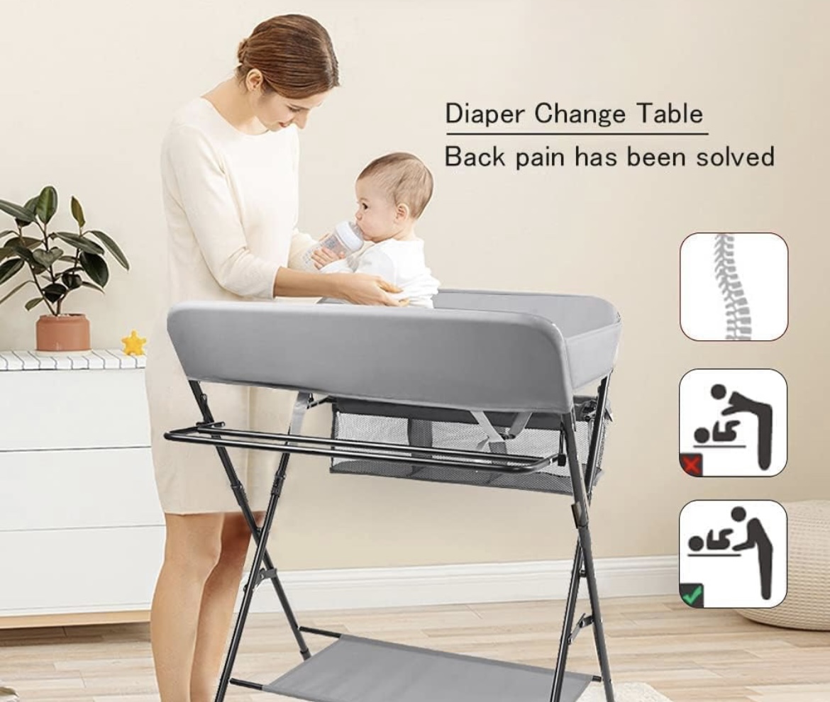 This is a baby diaper changing table. It is grey and has a metal frame. There is a shelf underneath the changing area and a small shelf on the side. There is also a safety strap to keep the baby in place.