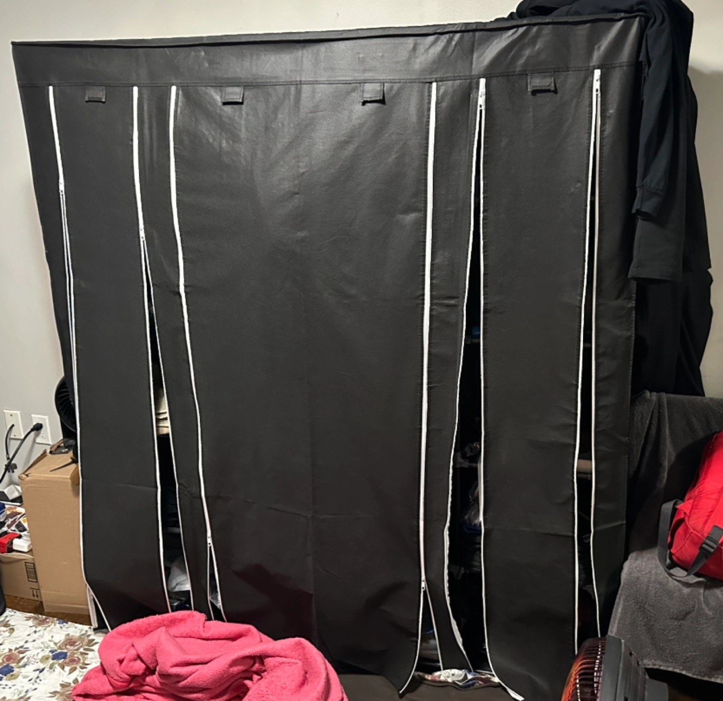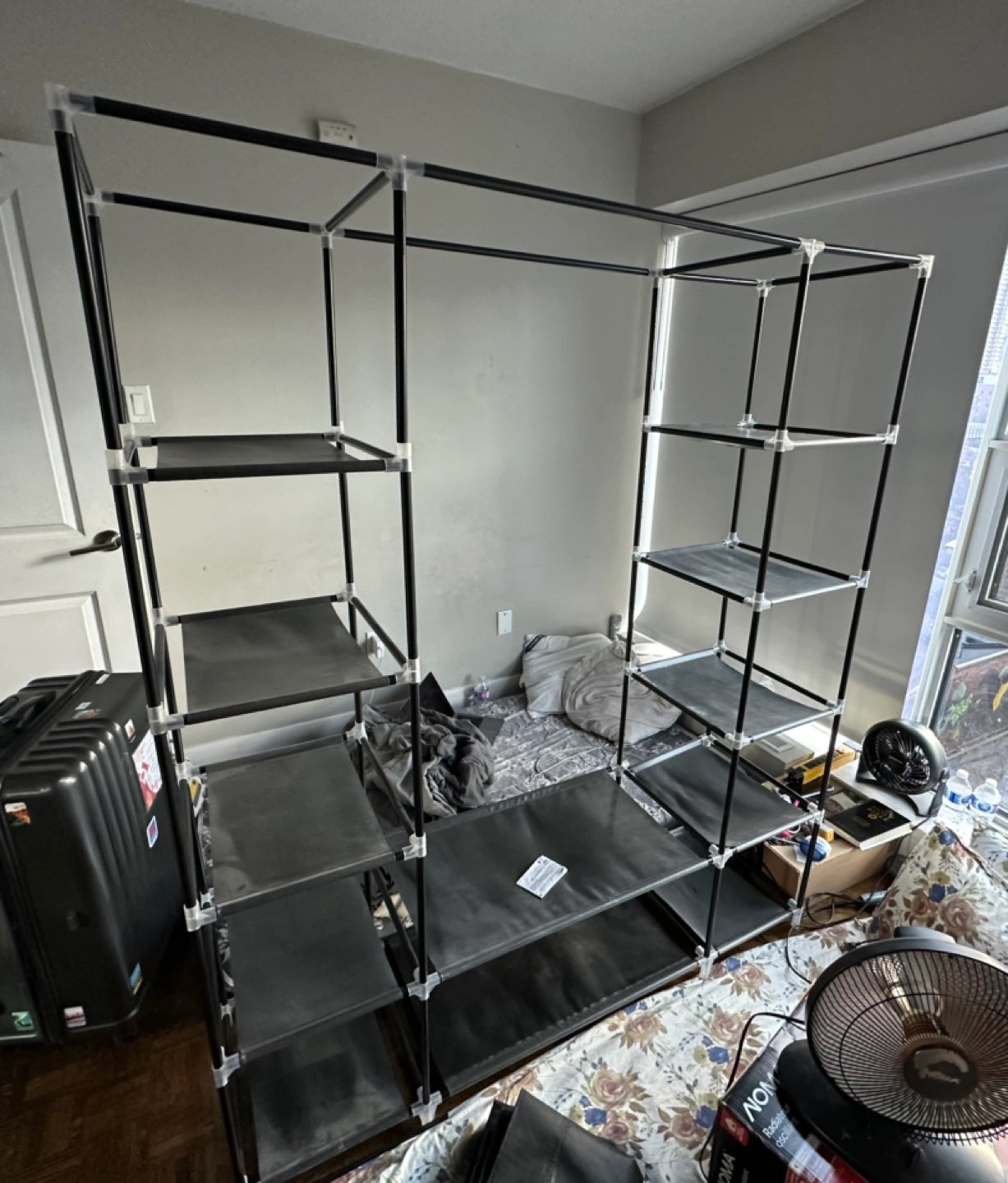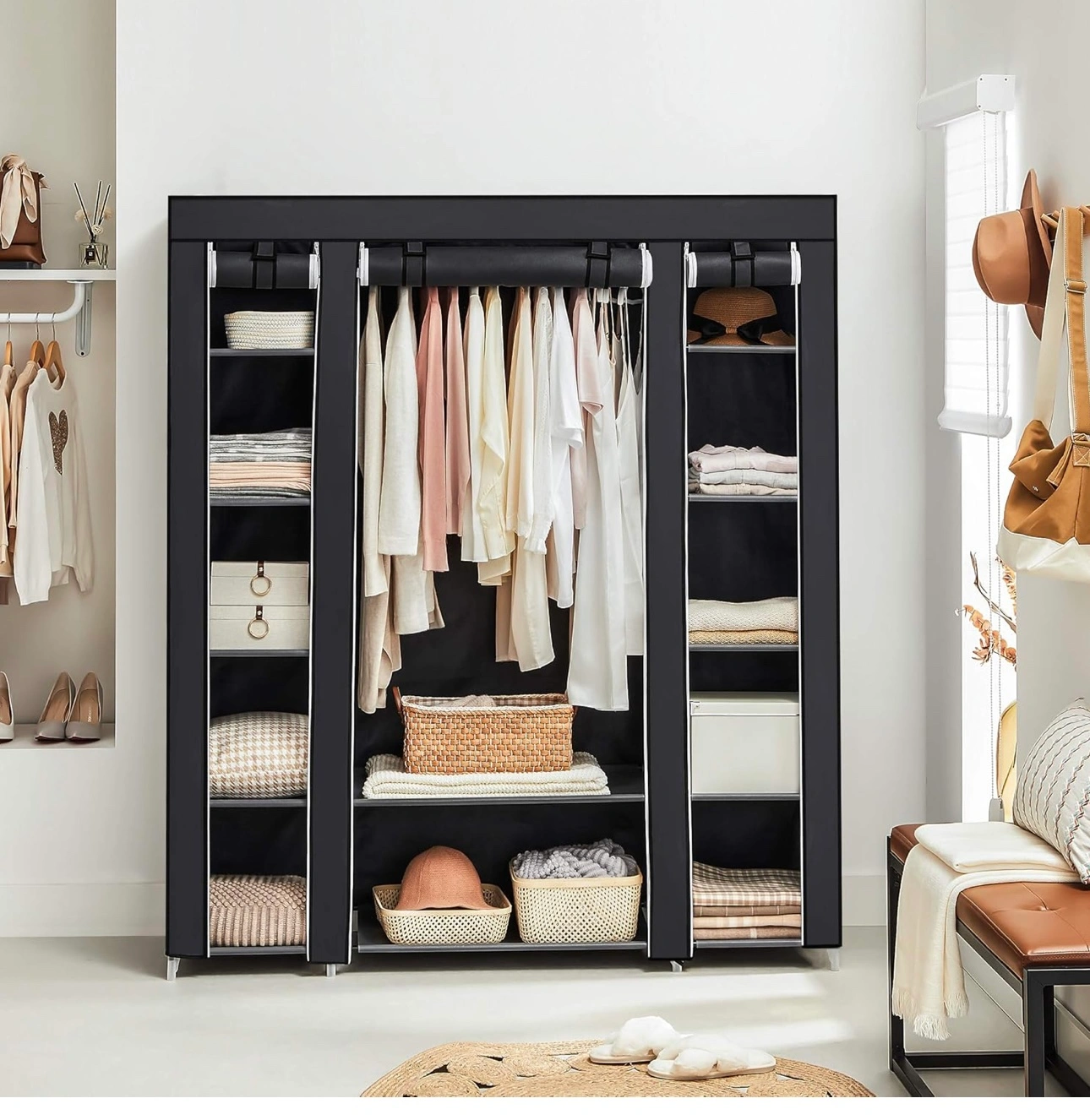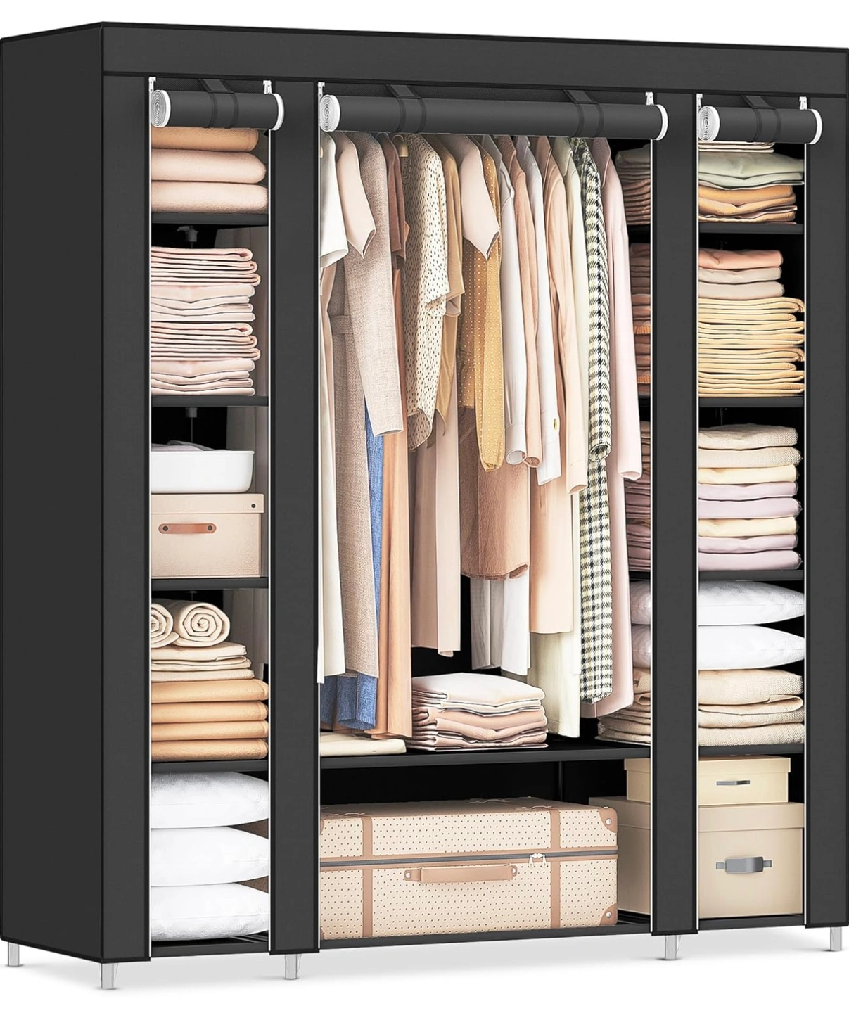 The closet is large and spacious, with multiple shelves and a hanging section. It's perfect for organizing your clothes, shoes, and other items. The closet is also easy to assemble and disassemble.