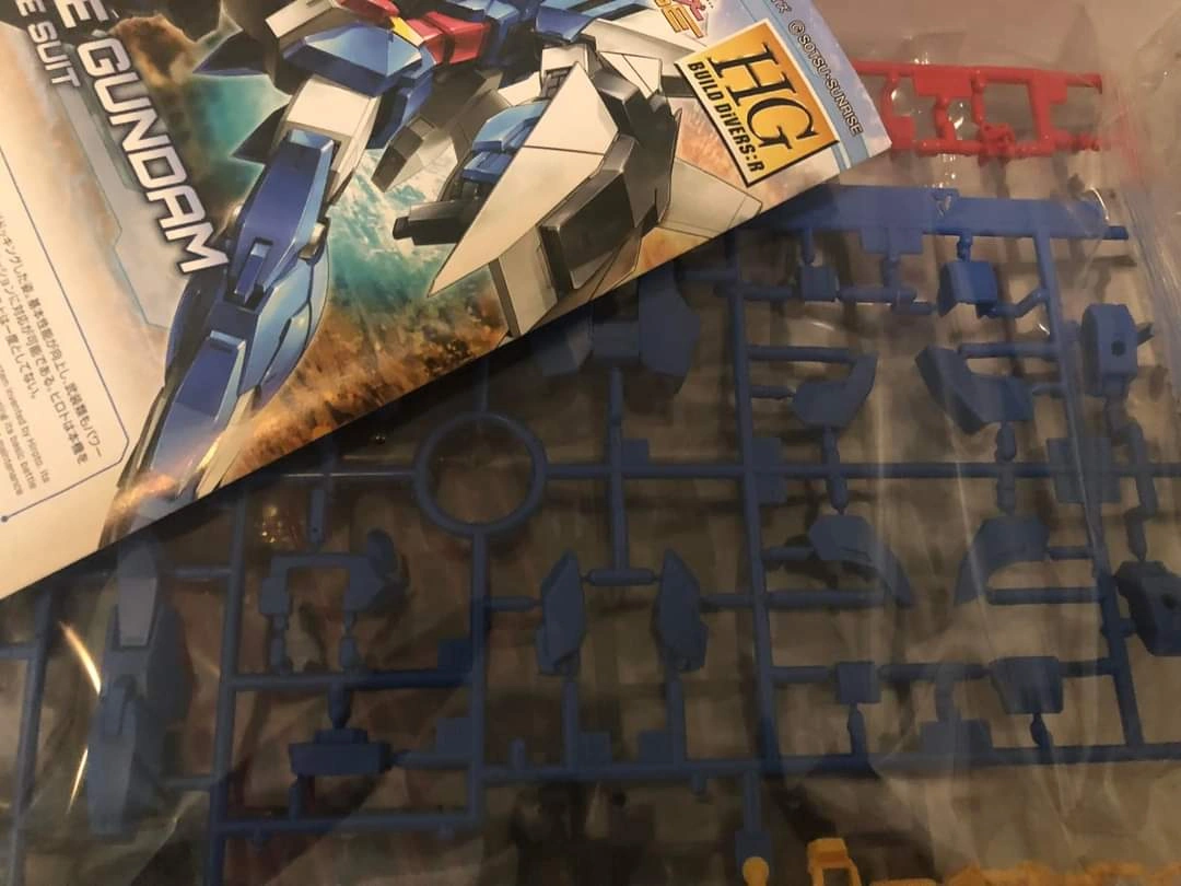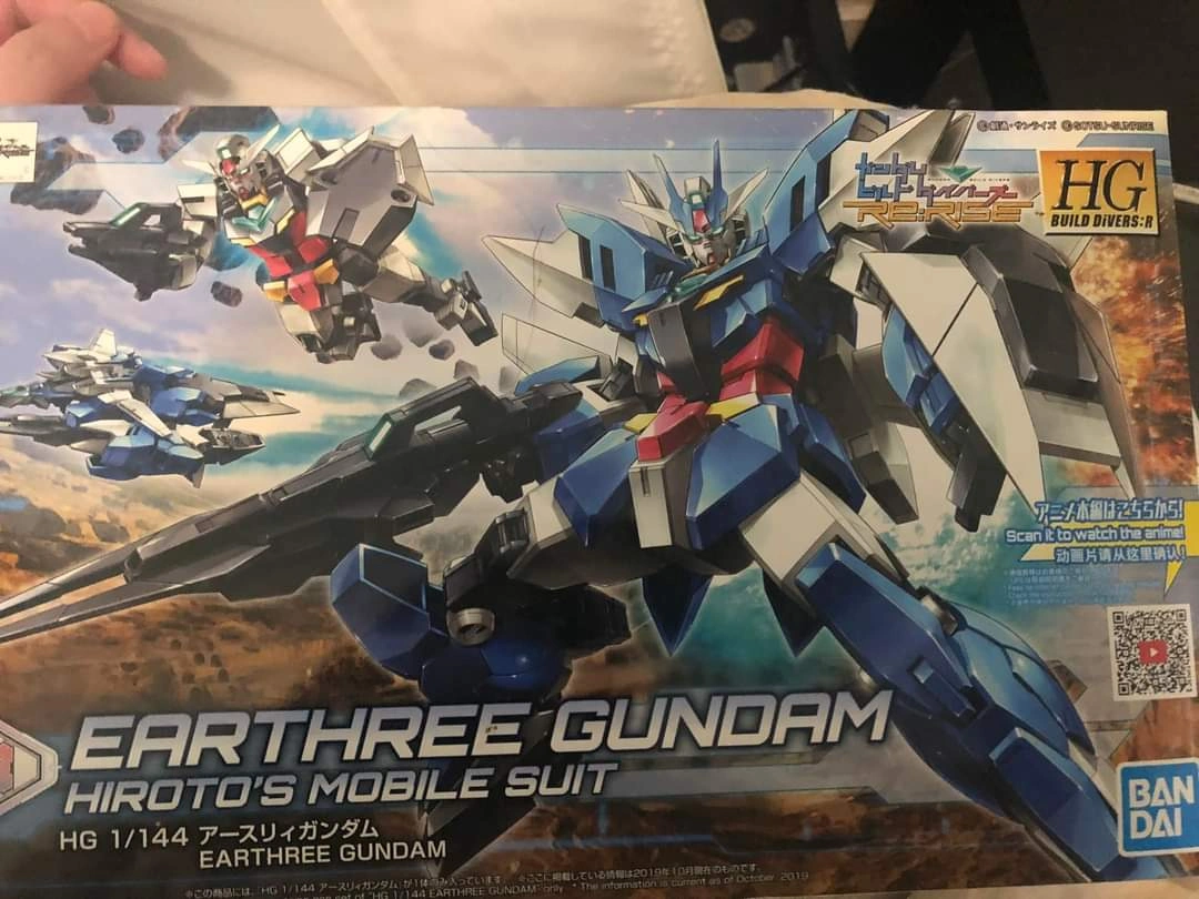 A model kit of the Earthree Gundam from the anime series Gundam Build Divers: Re:Rise.