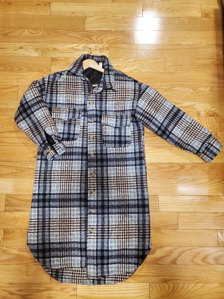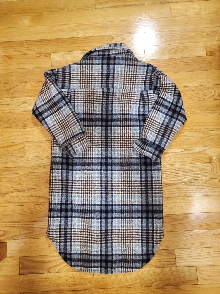 Long-sleeved, button-down shacket with a plaid pattern in shades of blue, brown & grey. Has two chest pockets and a curved hem. The jacket is fully lined -- super warm & cozy for the fall season! Made in Korea π°π·