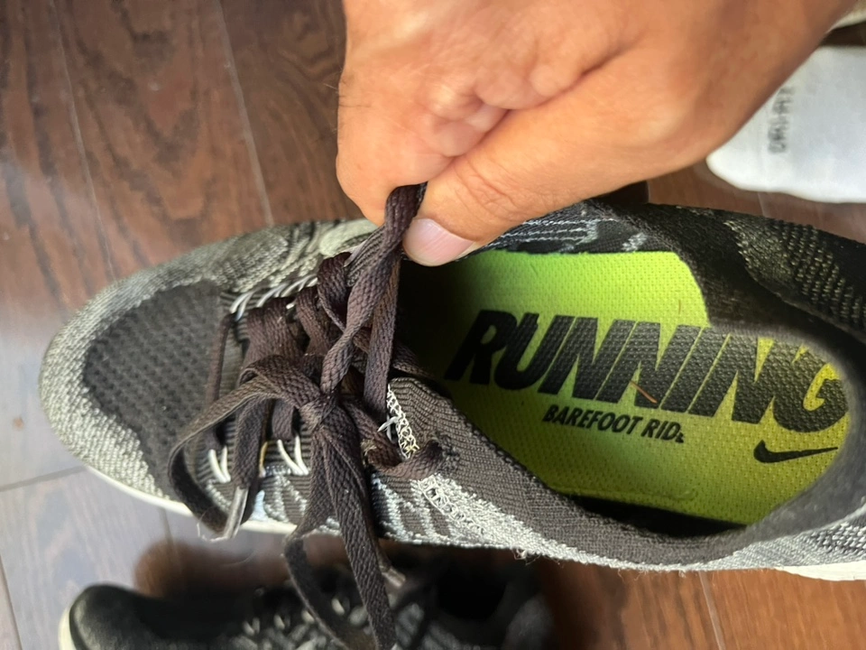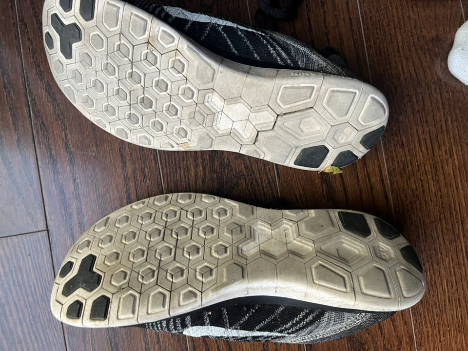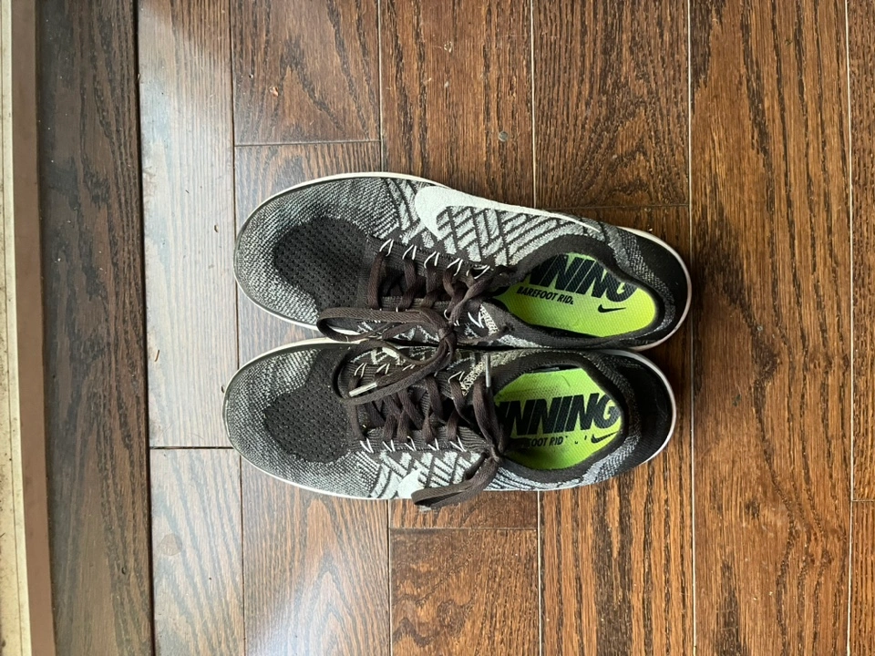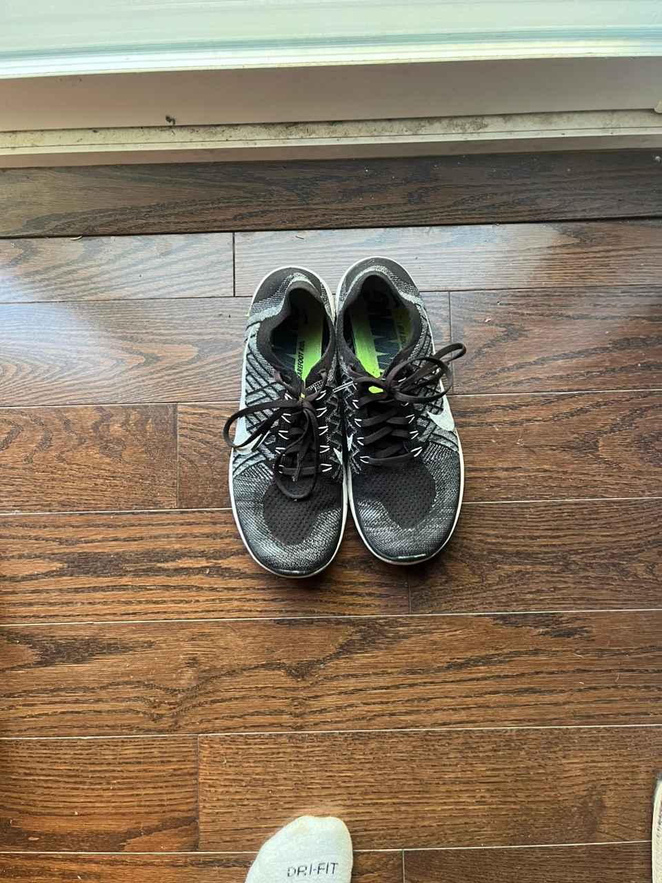 Black, grey, and white running shoes with a flyknit upper. These shoes are a size 11. They have a bright green insole and come with black laces.