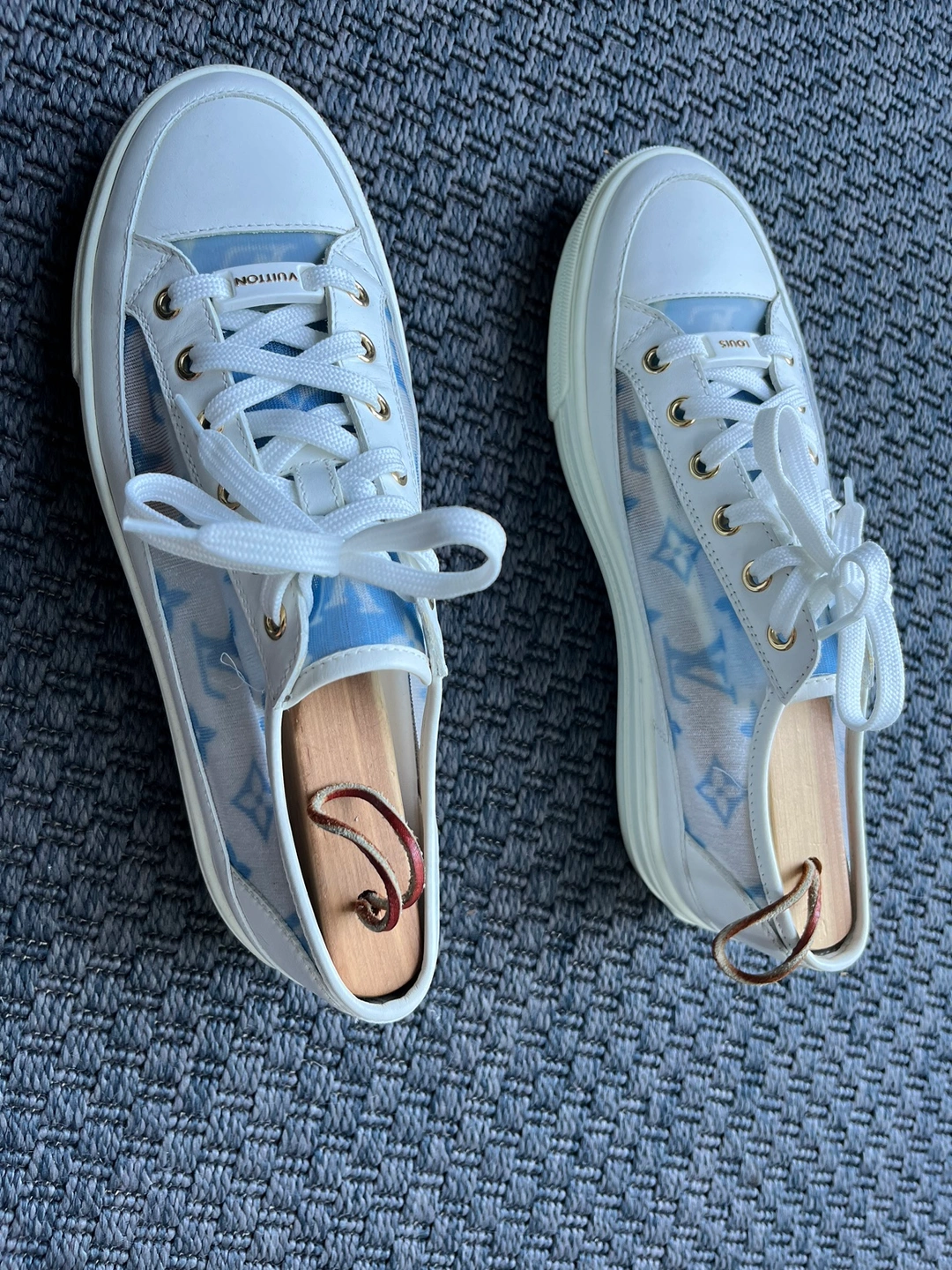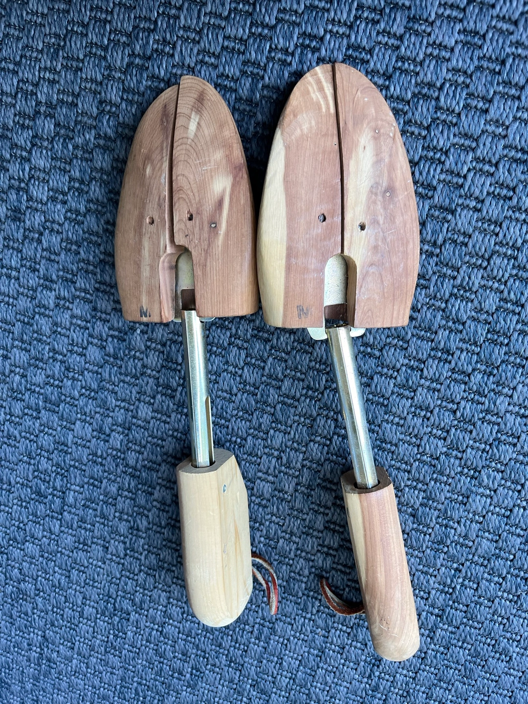 Pair of Johnston & Murphy shoe trees with adjustable metal rods and leather loops.