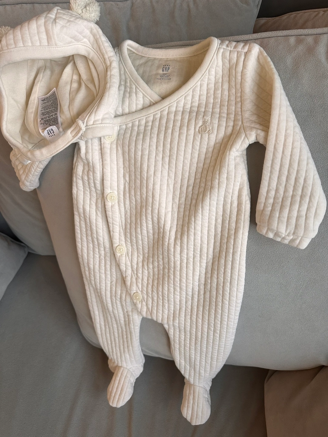 Cream ribbed kimono style padded sleeper with attached footies and matching hat.