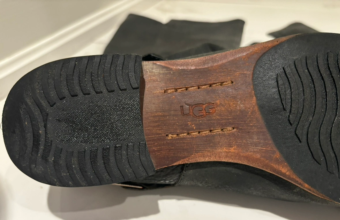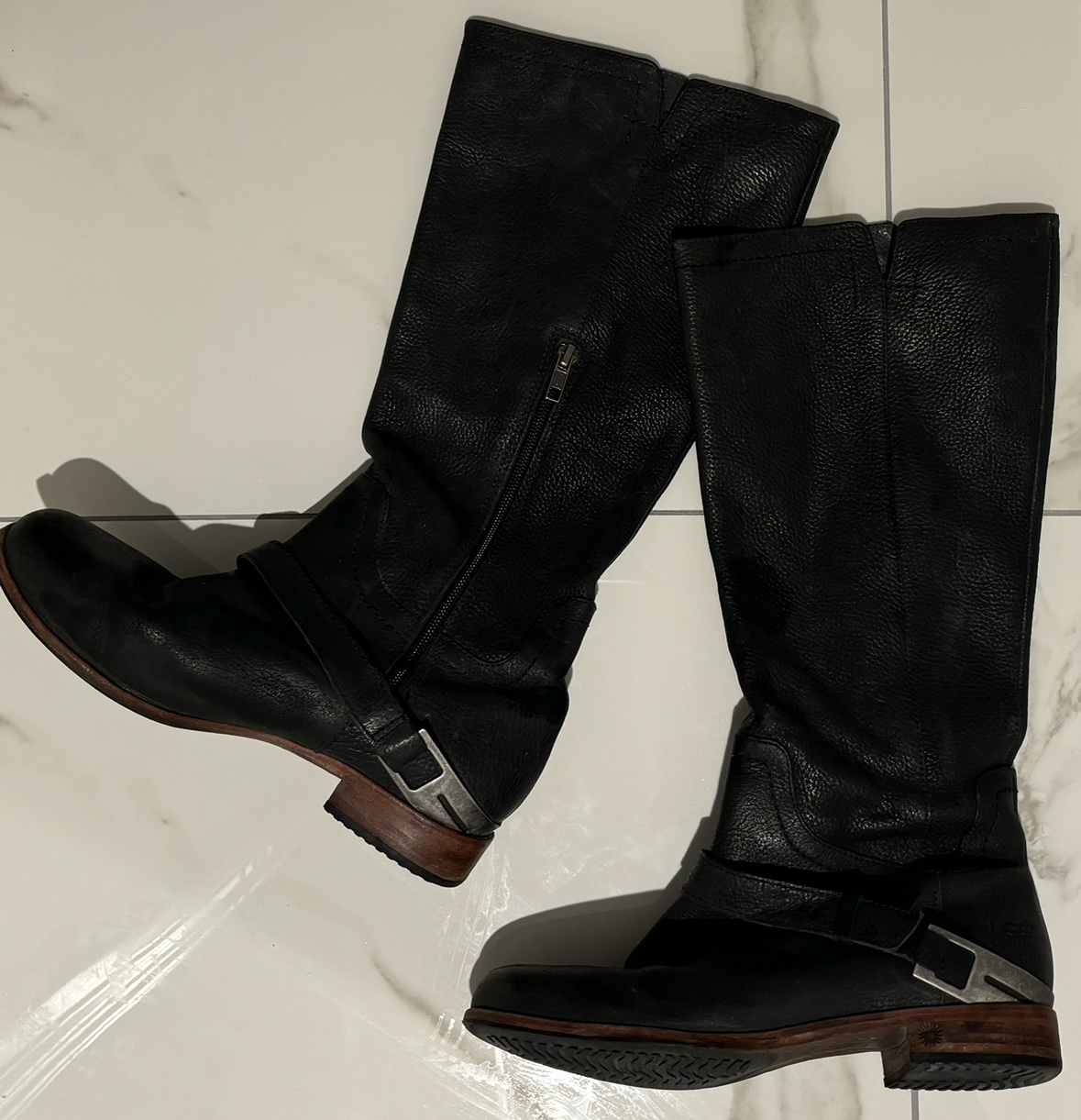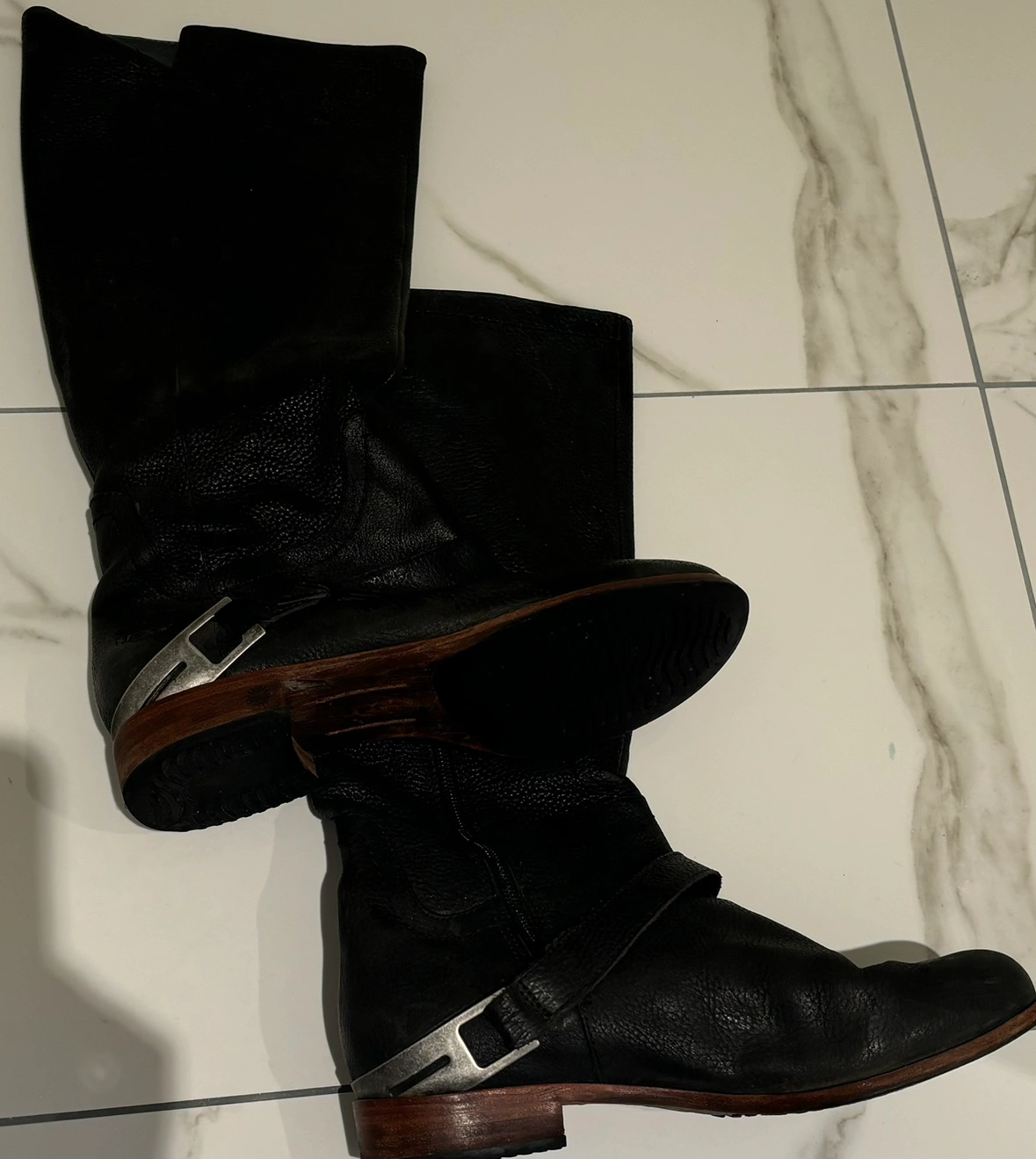 Black leather boots with silver buckle detail. Boots have a side zipper. The boots have a slightly rounded toe. The boots are approximately 14 inches tall. The boots are size 8.