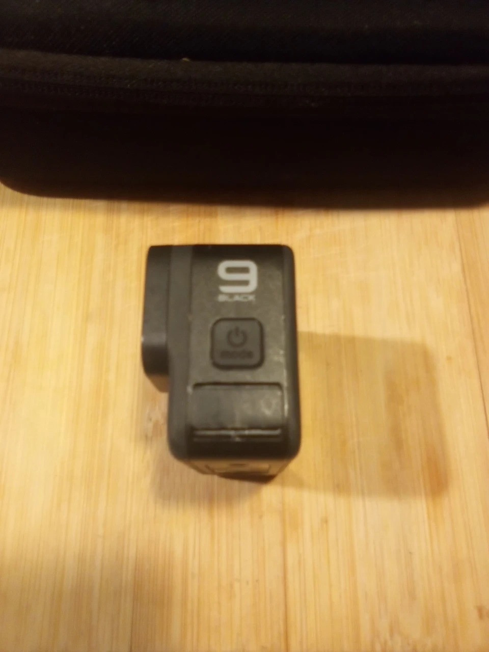 Selling a GoPro HERO9 Black action camera. It's a complete package and includes the camera, batteries, a charger, a mount, and a carrying case.