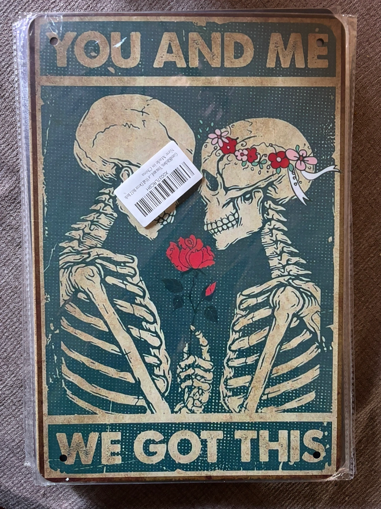 286This is a metal sign with a skeleton couple holding a red rose. The sign says "You and Me We Got This". 8x12