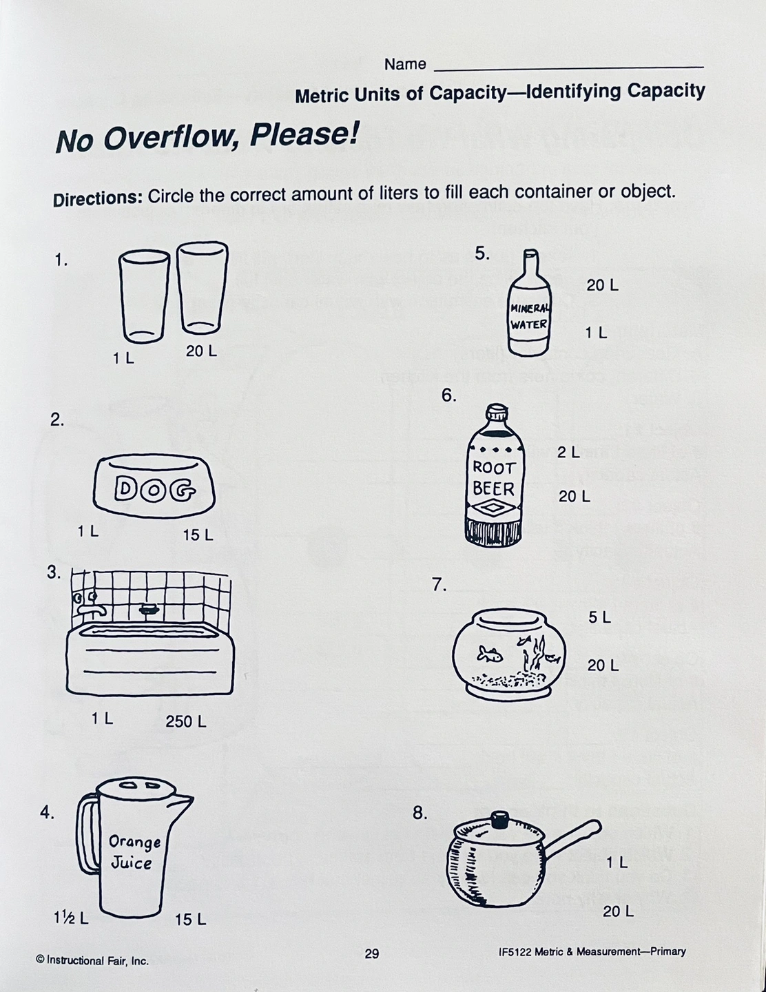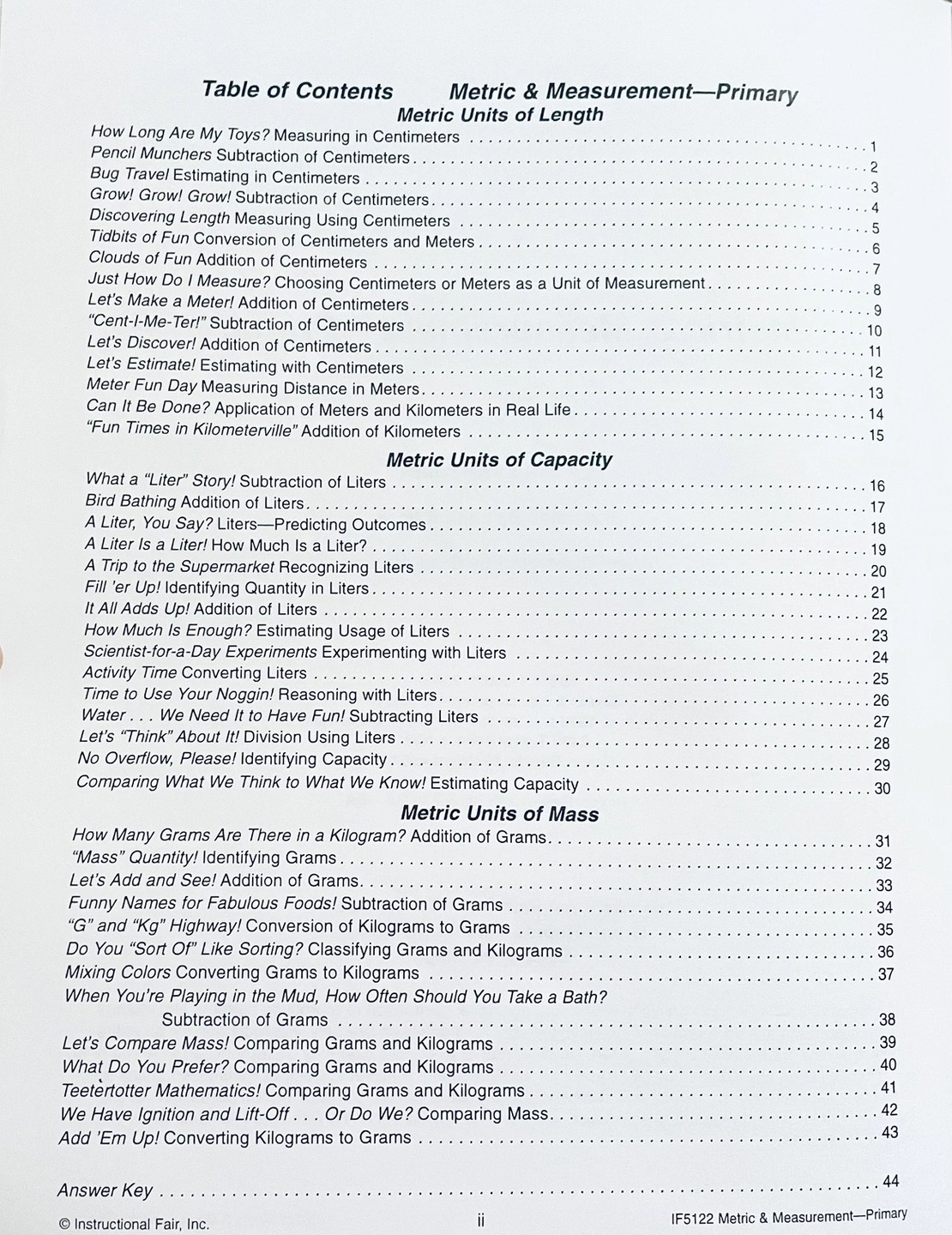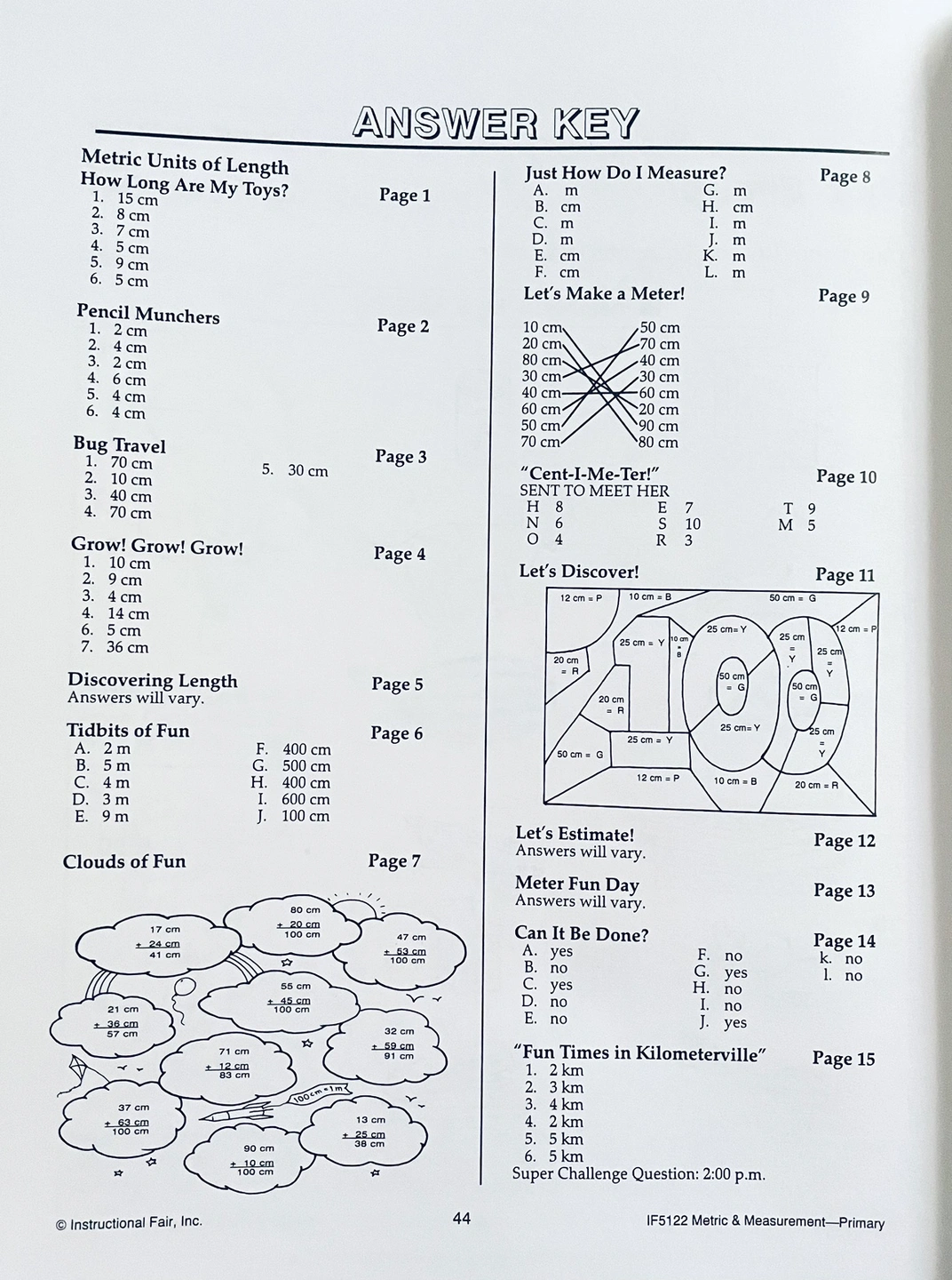 Metric and Measurement is an unused vintage workbook by Bill Linderman for kids to learn about and practice concepts in measurement. Includes: