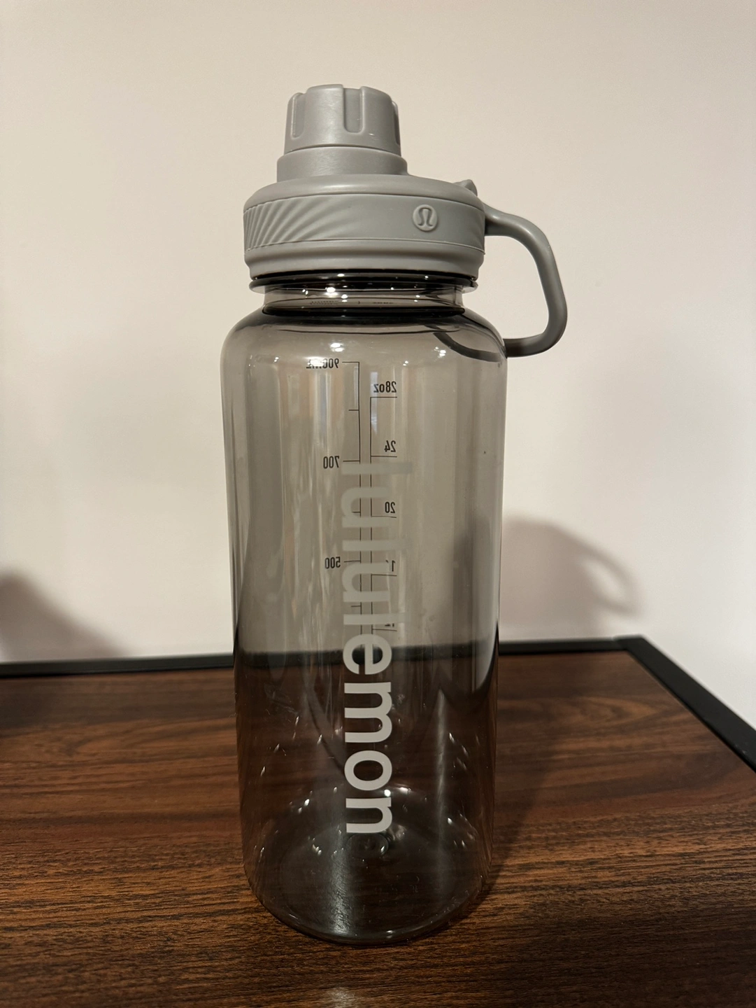 A clear plastic water bottle with a grey lid and handle. It has the lululemon logo on the lid. The bottle has markings in ounces on the side. Used once!