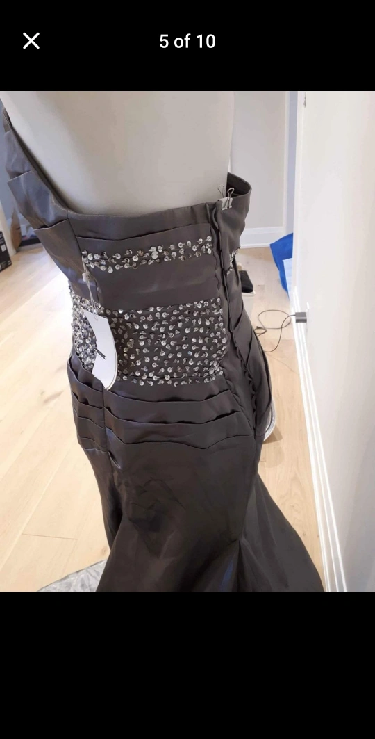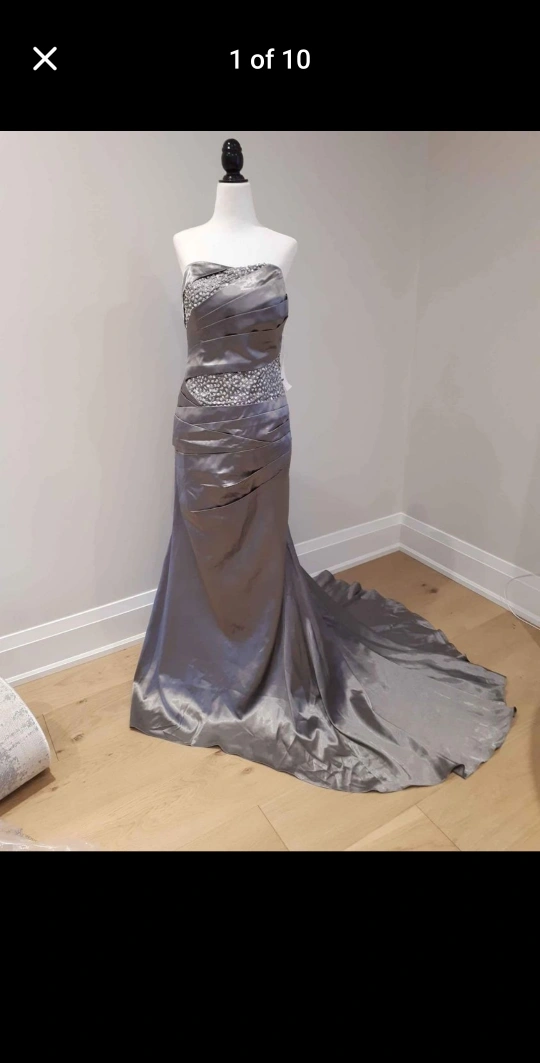 Floor length strapless dress with a fitted bodice and an A-line skirt. It has beading on the bodice and a sweep train. This dress has a zipper closure in the back. Size 16. Bust 38 1/4", waist 31", Hip 41 1/4"