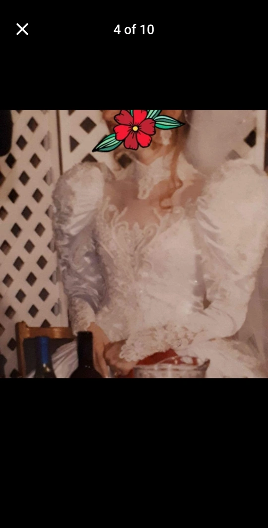 Long-sleeved lace bridal gown with a large train and a high neckline. This gown features a fitted bodice and a full skirt. There is also a veil and a headpiece. The dress is a size 8. A great dress to wear for a vintage themed wedding or an alternative wedding.
