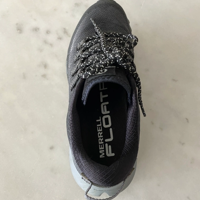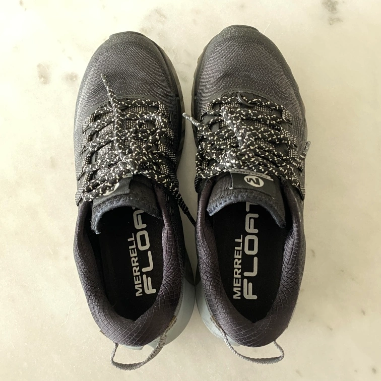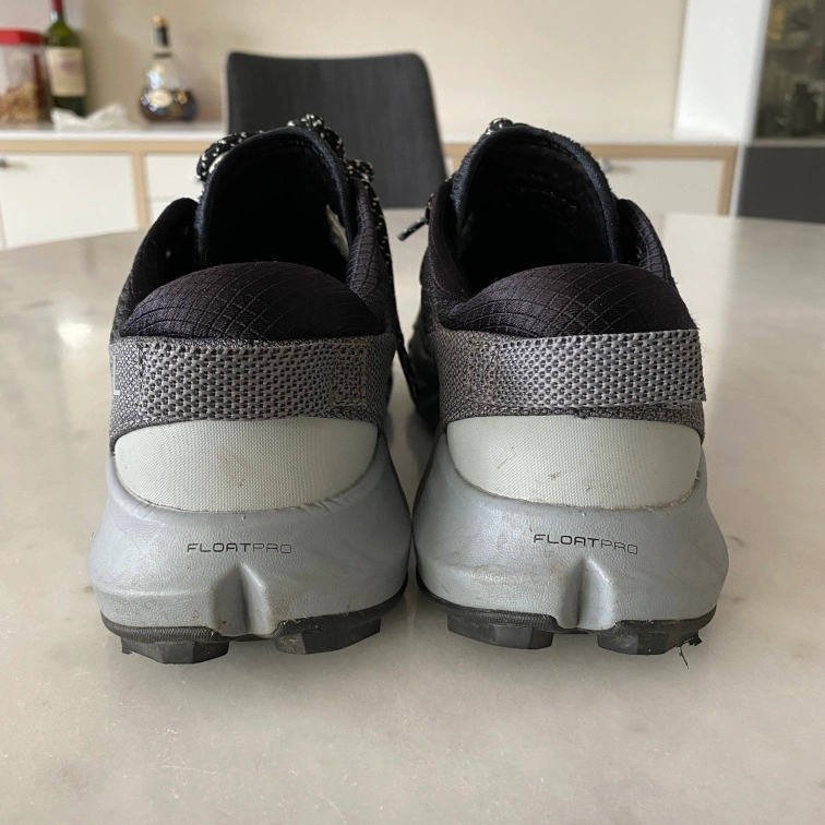 Black running shoes with grey accents and black laces. The shoes are size women 6.5. They have a grey and black "FloatPro" outsole and a grey and black "Vibram" midsole. The shoes also have "FlexConnect" technology on the midsole.