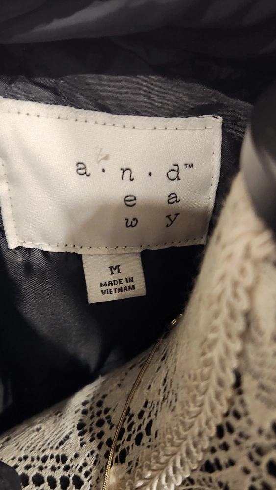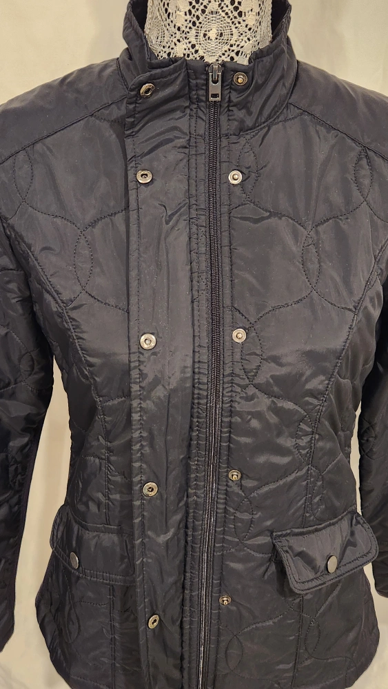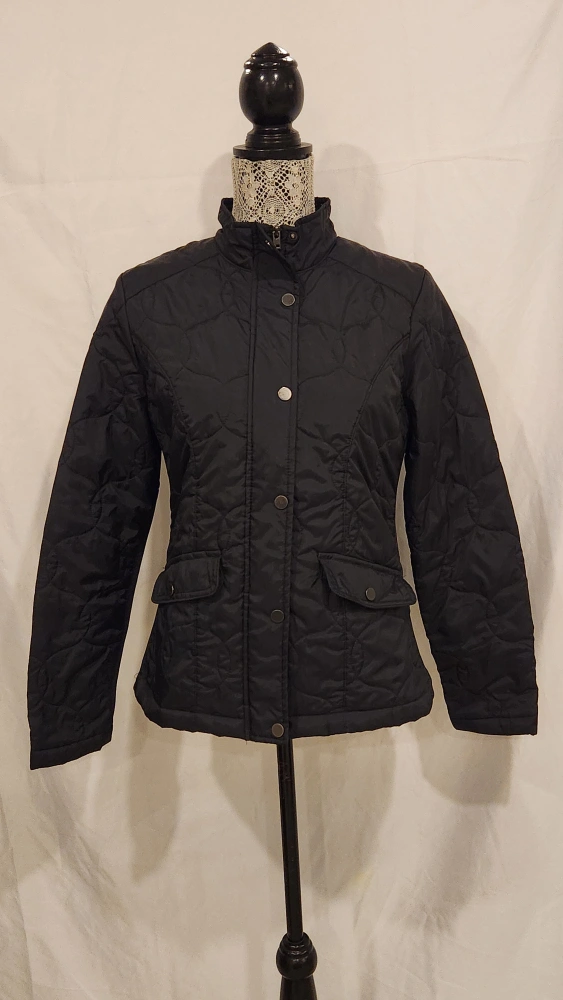Black quilted jacket with a zipper and button closure. It has two pockets, one on each side. The jacket is lined with a soft fabric. It is lightweight and perfect for layering.