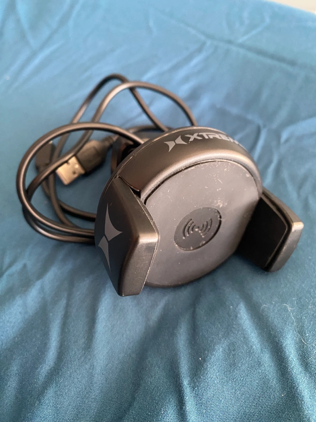 A wireless car charger with a built-in vent mount. It is black and comes with a USB cord for charging. The cord can be plugged into the cigarette lighter port or USB port in a vehicle. The phone mount is adjustable. Pickup in Metrotown/Patterson area.